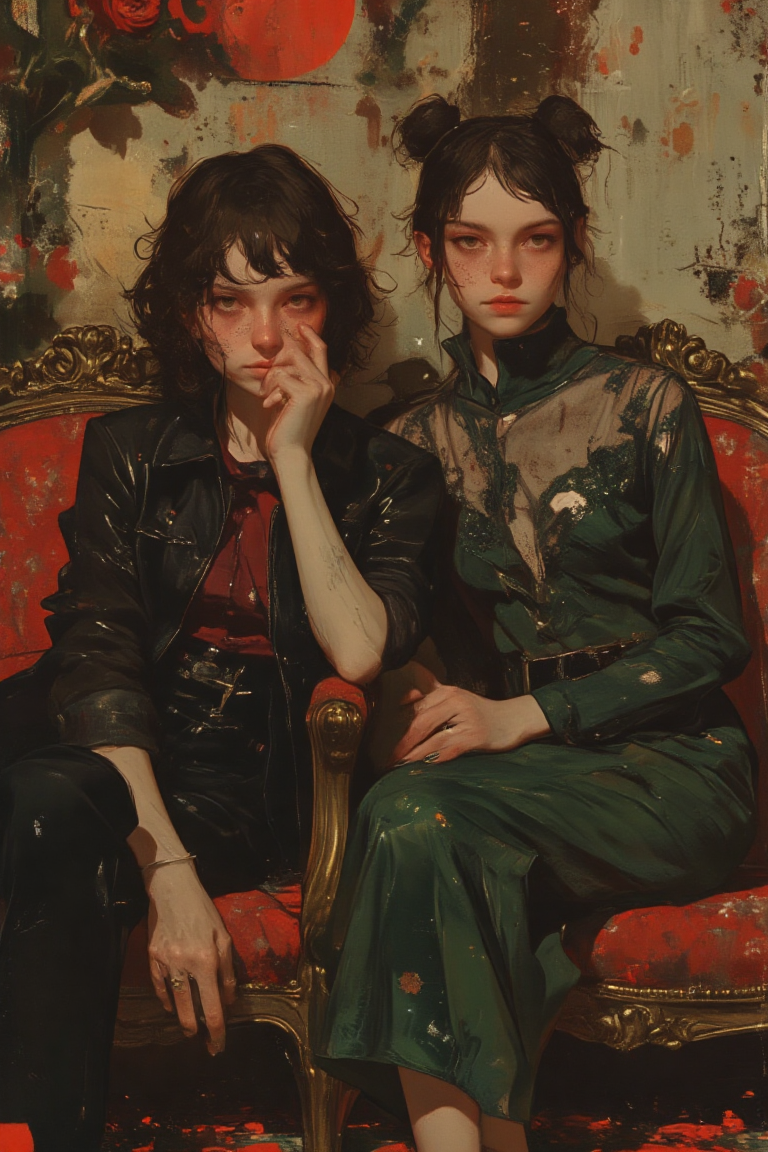 This high-resolution photograph features two women seated on plush, velvet armchairs in a luxurious, retro-inspired room. The woman on the left wears a fitted black leather jacket over a satin burgundy blouse, paired with high-waisted, black wide-leg trousers. Her hair is styled in loose curls, and her makeup is bold, with a deep red lip. She leans slightly forward, resting her left arm on the armrest and her right hand on her lap. The woman on the right is seated on a similar velvet armchair, wearing a fitted emerald green midi dress with lace detailing along the neckline and sleeves. Her black heels add to the elegant vibe, and her hair is styled in an elegant updo with a few soft tendrils framing her face. She gazes directly at the camera with a calm, serene expression. The setting includes vintage decor, with gold accents and soft, ambient lighting that enhances the rich colors of their outfits. The overall mood is one of sophistication and old-world charm, blended with a modern, edgy twist.