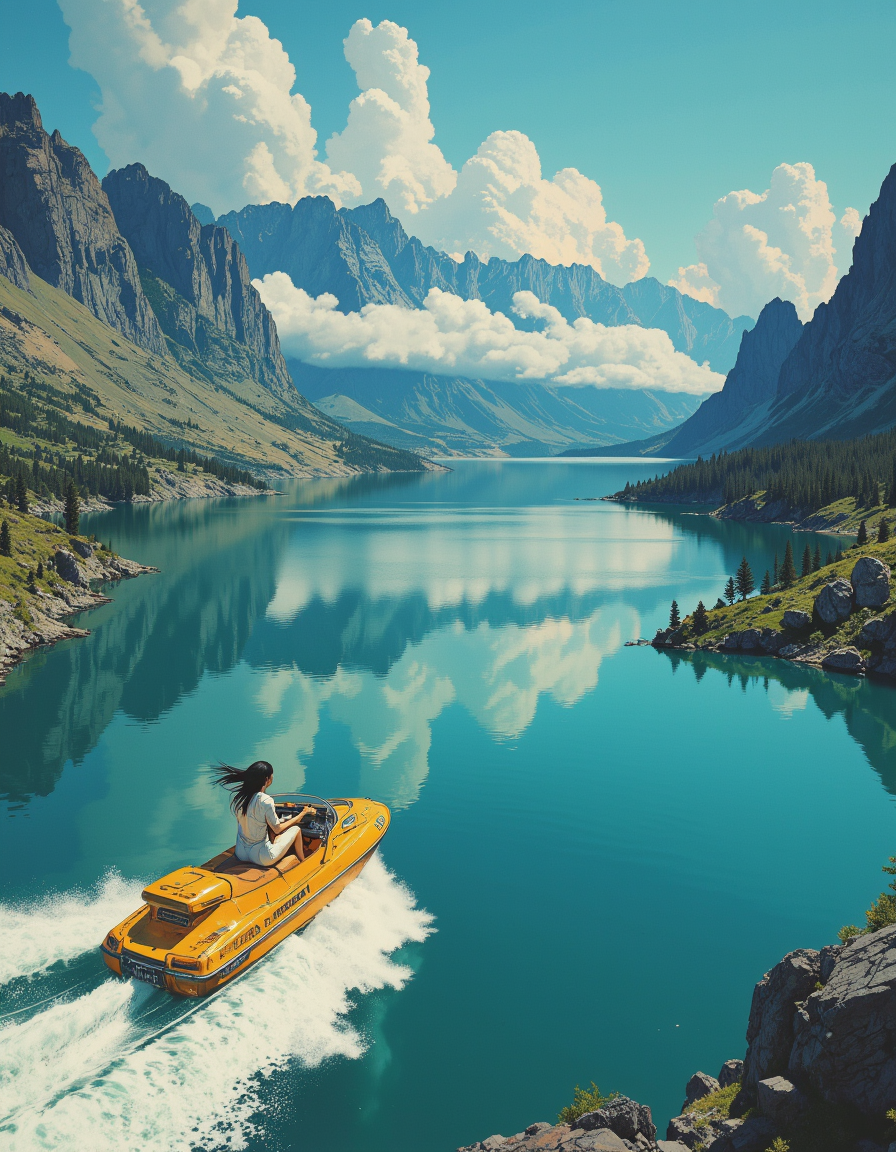 in the style of cksc, dark fantasy aesthetic, digital artwork of a futuristic, fluorescent colors, epic. luminescence, ultra realistic, hyper detailed, soft lighting , (Frank Frazetta), epic scale. (detailed digital painting, detailed oil painting). Rear view from above. A girl in a white tight-fitting suit is racing at high speed on a jet ski across the smooth surface of a turquoise mountain forest clear lake surrounded by picturesque mountains. Columns of spray rise and waves disperse. Her long black hair is blowing in the wind. The blue gradient sky with clouds is reflected in the purest lake. Transparent clouds of fog are slowly descending from the mountains. A trick of the light.,, .. masterpiece, best quality, medium-format camera, high-contrast, dramatic lighting, striking composition, CPA