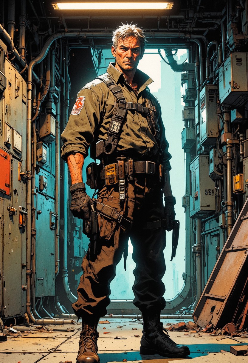 Isaac Clarke, a rugged and weary engineer, stands heroically in a dimly lit, eerie environment, with a mixture of industrial and sci-fi elements, reminiscent of a abandoned space station, with metallic walls, flickering fluorescent lights, and ominous shadows. Inspired by the styles of Syd Mead, H.R. Giger, and Zdzisław Beksiński, with a blend of dark, gritty realism and biomechanical horror elements, and a color palette of muted grays, blues, and oranges, evoking a sense of tension and foreboding.