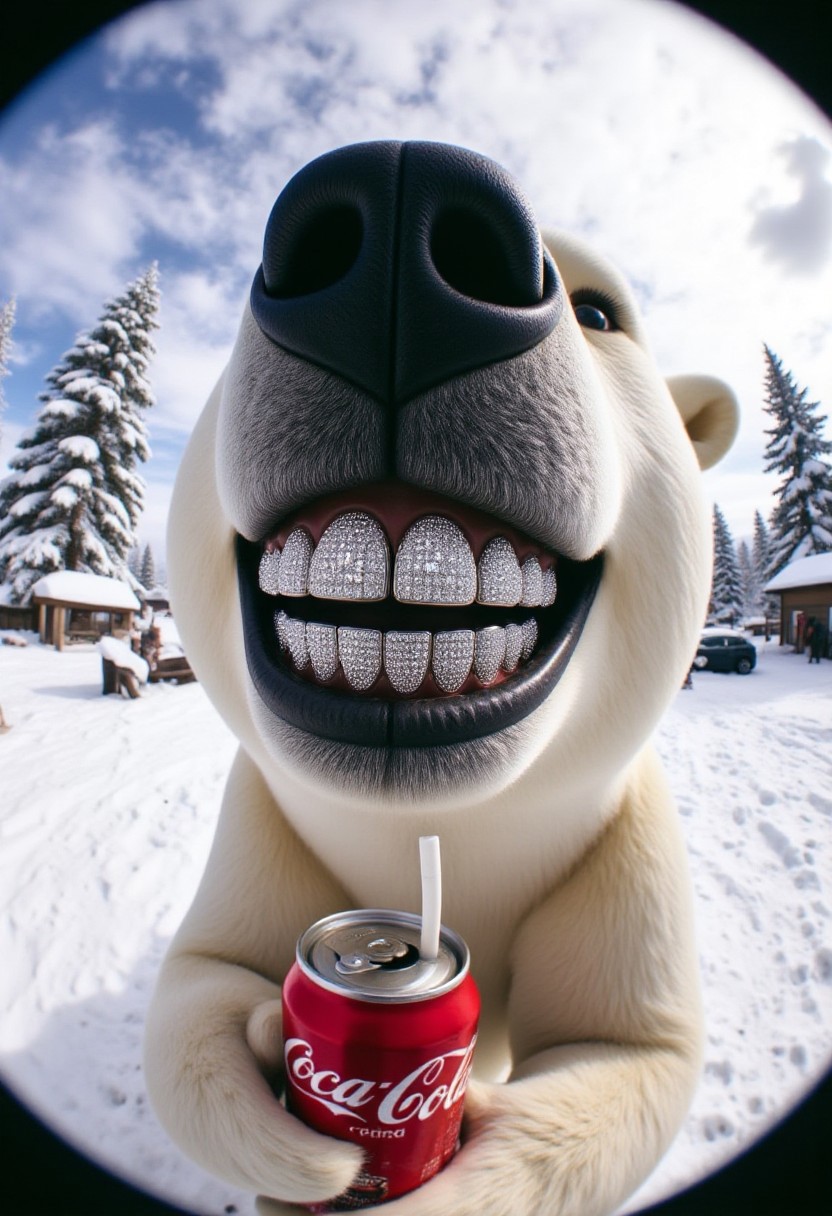gr!llz, fish eye lens realistic photograph of a white polar bear with a wide smile, its teeth are encrusted with shiny platinum diamonds. It's holding a coca cola.