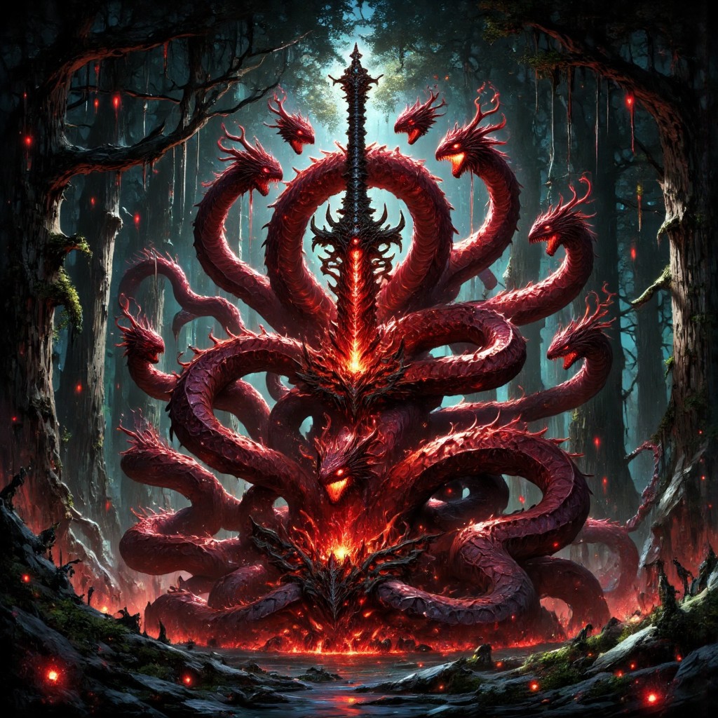 A red glowing fantasy sword curse altar is lost in a dense and dark forest. The curse sword altar is glowing in a dense and dark athmosphere, surrounded bay giant dark trees of the forest. the sword altar is a giant red hydra. The illustration is very detailed with intricate details and in a realistic fantasy oiled painting style.