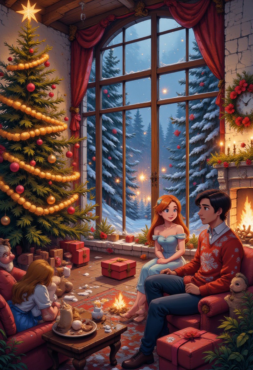 score_9, score_8, score_7, best quality, 4k, anime, Disney Princesses, Christmas sweater, off shoulder, on the sofa, Christmas living room, indoor, fireplace, evening, snowing huge glass window, christmas_tree,