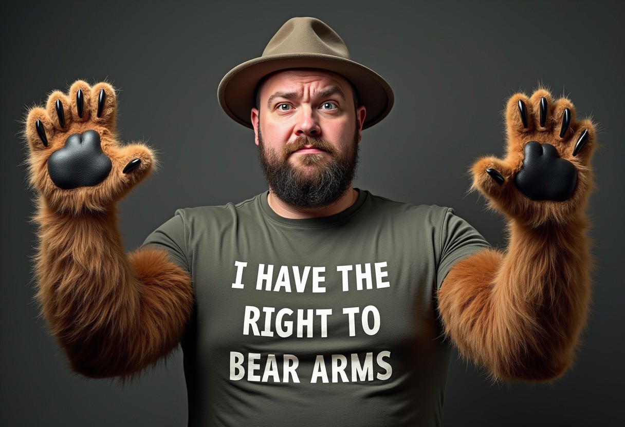 A man with a confused face, wearing a hat and a t-shirt. He is fully human except he has two bear arms, complete with paws and claws. The arms have a slight magical glow. His t-shirt is printed with text: "I have the right to bear arms"