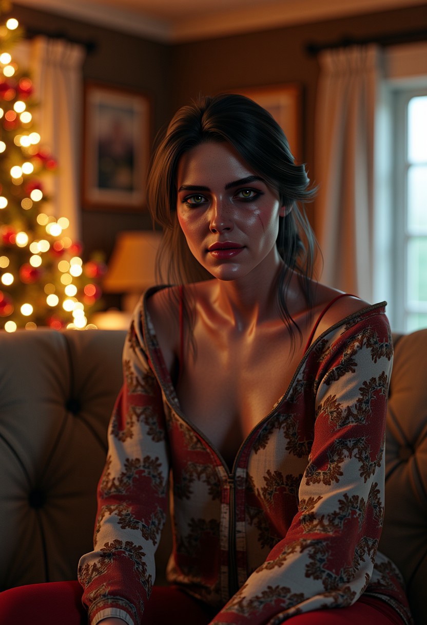 A photorealistic portrait of Ciri seated on a sofa. The backdrop is christmas living room