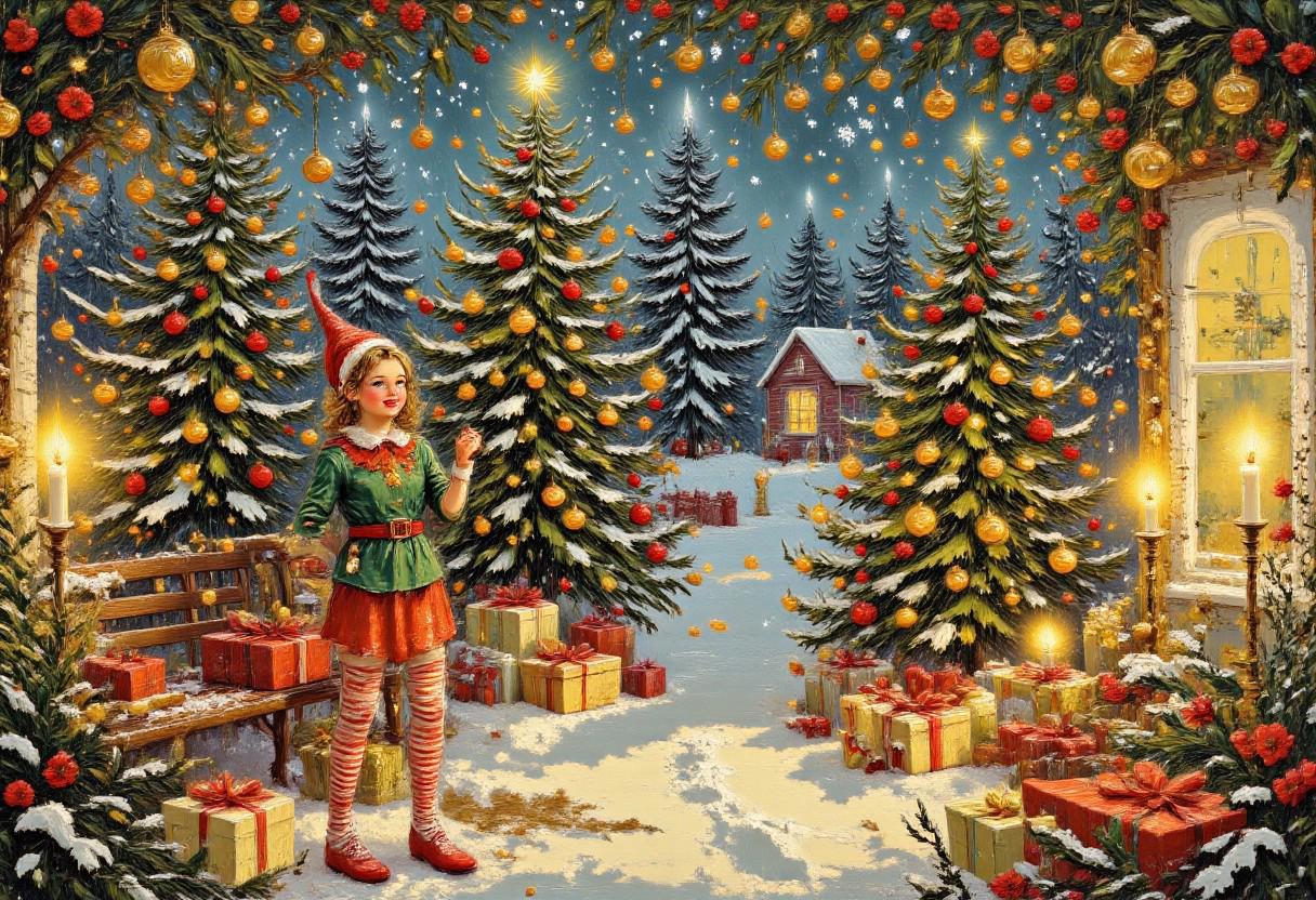 She has short, slightly tousled wavy blonde hair, decorated with a red-green pointed elf hat with a red tip. The elf is dressed in a classic green and red outfit, which includes a short tunic with a belt and a star emblem on the front, short sleeves and a matching green belt. Their legs are wearing red-and-white striped stockings with white cuffs, and his feet are shod in pointed red-and-green shoes. The background is decorated with lush festive Christmas trees, fantastic toys, twinkling lights and hanging transparent gold ornaments. Softly glowing candles are placed on the bench next to the elf, surrounded by colorful gift boxes decorated with ribbons. There is a warm, festive atmosphere, enhanced by a light snowfall in the distance and the lights of the side, creating a magical atmosphere. The elf's pose is relaxed and inviting, emphasizing the joyful spirit of the holiday season. The sparkling beauty of Christmas. The style of Michael Cheval, Michael Whelan, Rembrandt, Alex Alemany, Renoir, Alex Gray, surreal, bright colors, masterpiece, artificial image of the highest quality, diffuse lighting, ambient occlusion, Exquisite, masterful surrealism, Photorealistic, unreal engine, 128K, UHD, clear quality, light reflections, RHADS, atmospheric, 3D texture, 3D shading, ultra-three-dimensional effect, octane