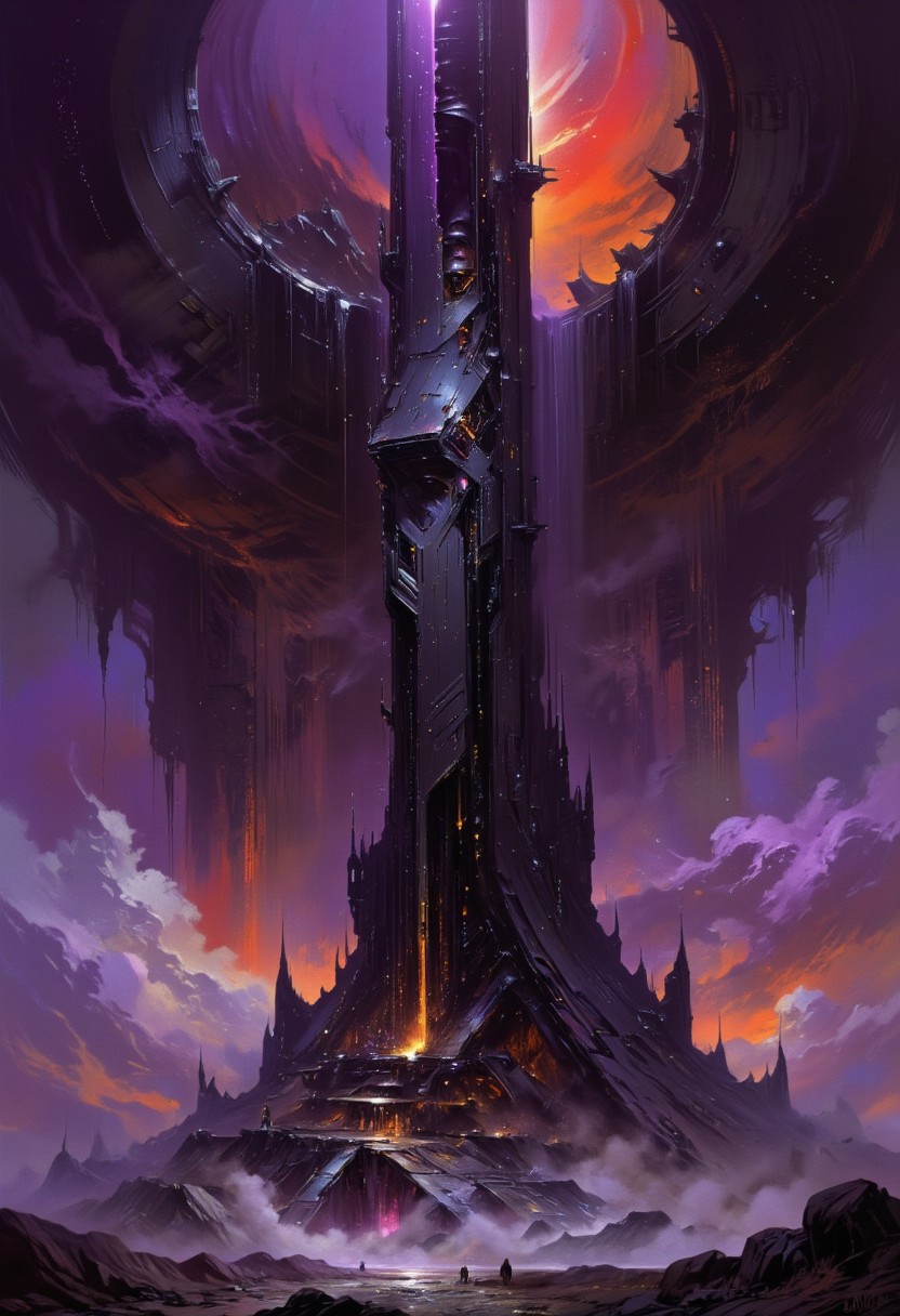 This is a digital artwork depicting a towering, giant endless geometrical tower, set against a dramatic, scifi backdrop. The tower is constructed with a metal, and small glowing geometrical windows. The structure is illuminated by a few bright dramatic, yellow lights, casting a neon glow. The background is a swirling, chaotic mix of purples and deep oranges, with a large, glowing red orb or vortex on the background of the image. The swirling colors create a sense of movement and chaos, suggesting a stormy or futuristic atmosphere. The ground beneath the tower is a dark alienscape, with a few small, shadowy silhouettes, adding to the sense of isolation and desolation. The overall mood of the artwork is mysterious and mesmerizing, with a sense of unknown or exploration. The texture of the artwork is highly detailed and realistic, with a focus on the appearance of the tower, enhancing the sense of scifi and domination. The image conveys a sense of adventure and awe-inspiration.night sky,scifi,Neo-Brutalism,Futurism, colorful, vibrant colors,color contrast,light particles, high saturation,deep rich colors,vivid colors,shimmer,mysterious,dramatic,centered,depth of field,directional lighting,godrays,dense fog,visionary,beoynd-reality, dreamcore,suspenseful,scenery,forced perspective,epic scale,(close-up:1.6), John Harris Moebius Wayne Barlowe Roger Dean