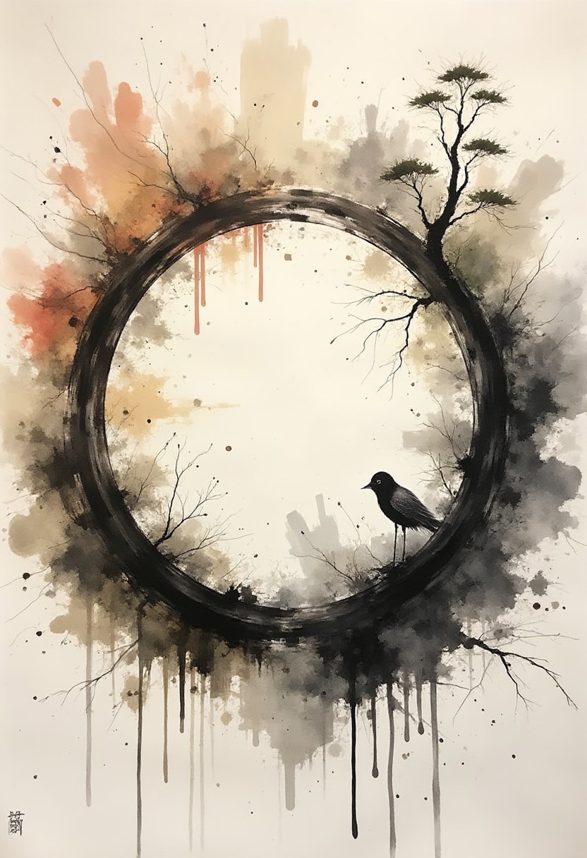 A dinkwfsn style painting, of a Japanese Enso Zen Circle