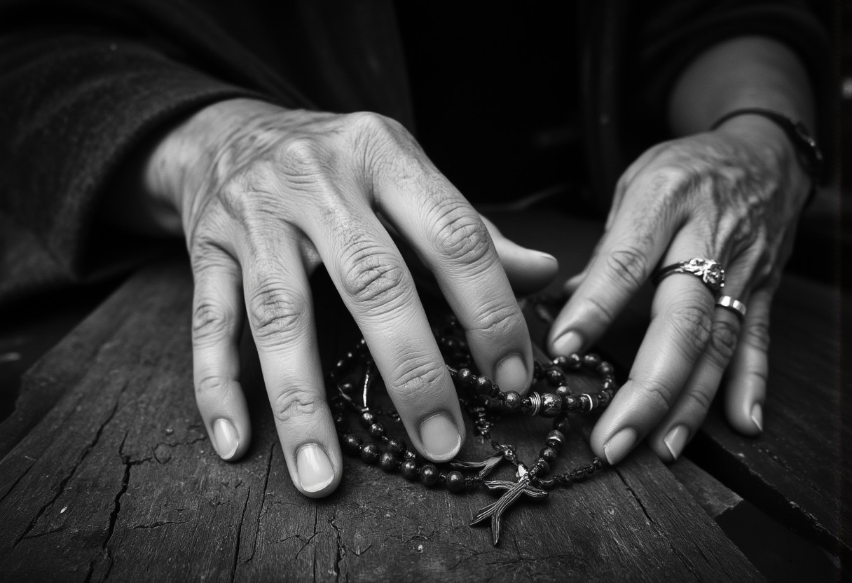 A close-up monochrome shot of an elderly woman's hands clutching a string of rosary beads, her wedding ring catching the light. The deep lines in her fingers echo the texture of the cracked wooden bench she sits on, as a crumbling chapel looms in the background.