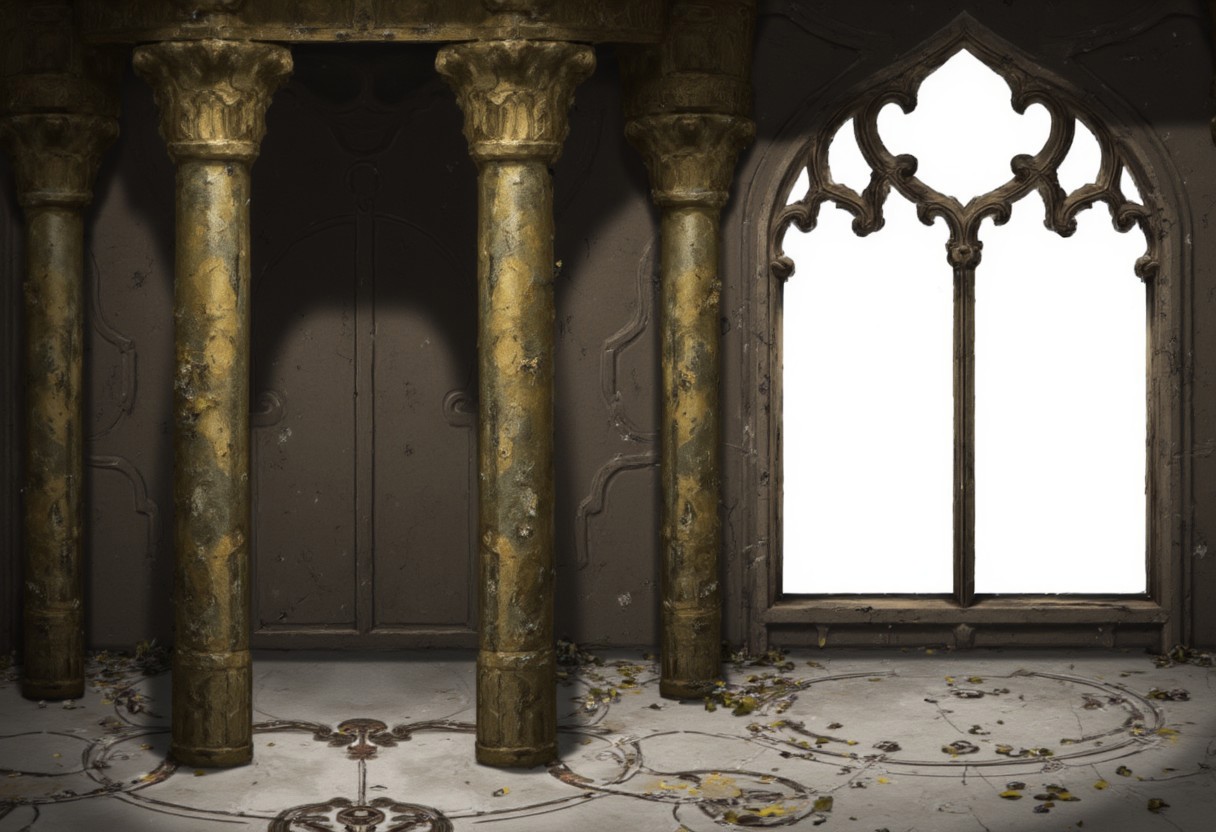 This is a situation-room picture asset image taken from Stellaris. The design showcases an abandoned royal palace interior. The left side features grand, decayed pillars adorned with faded golden motifs and intricate carvings, hinting at a bygone era of opulence. Cracked marble floors extend beneath, littered with small debris and worn patterns. On the right side, there is a large window with a pristine white backdrop, its arched frame intricately detailed with filigree, juxtaposing the desolation within. The setting conveys a haunting beauty, encapsulating the remnants of regal splendor lost to time.
