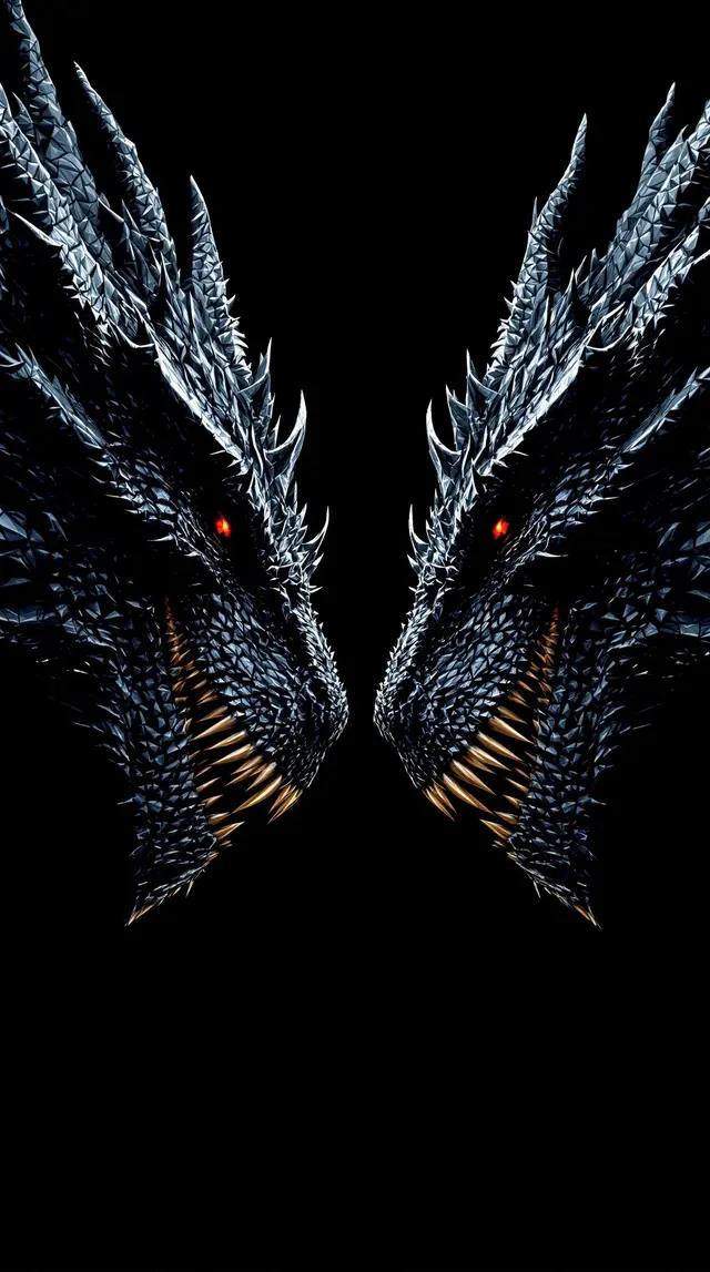 Two colossal dragons, facing each other in a dramatic, close-up profile view. Their massive heads, featuring sharp, pointed horns, are detailed with intricate, rough, scaled textures. The scales appear dark gray and black, with subtle variations in tone showing depth and dimension. Their mouths are agape in a roar, revealing rows of jagged, sharp teeth. Fierce red eyes are prominent, emphasizing intense, aggressive energy. The dragons' features show a palpable sense of power and hostility. Dark background highlights the dragons' forms, emphasizing their imposing size and presence. High contrast lighting accentuates the intricate details of the scales and textures. The visual style is realistic and detailed, suitable for a fantasy environment. Very dramatic and cinematic. Detailed, powerful, stylized. photorealistic. dark, grim, fantasy.
