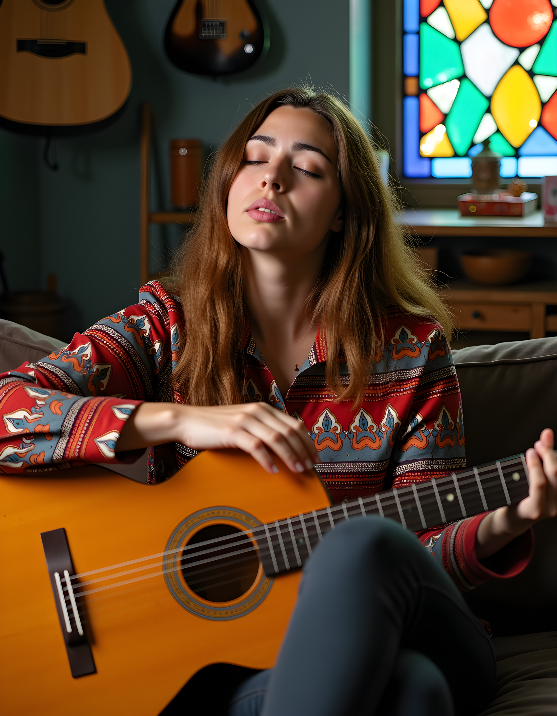 In a dimly lit, bohemian-chic living room adorned with vintage instruments and eclectic artwork, a captivating woman named M4DF46, with her long, wavy chestnut hair cascading down to her waist, is poised in an intimate close-up shot. Her eyes are closed as she leans back on a worn velvet couch, her lips parted slightly, revealing a single, radiant dimple and a hint of pearly white teeth. A delicate mole rests just below the corner of her left eye, adding to her enigmatic allure. She wears a vibrant, intricately patterned long-sleeved shirt that exudes an air of mystery and confidence, as she cradles a vintage, sun-faded acoustic guitar, its wooden body casting warm shadows across her delicate features in the soft, ambient light filtering through the room's large, stained glass window. The emotional tone is one of quiet contemplation and creative passion, capturing a moment of introspection and inspiration in this intimate setting.
