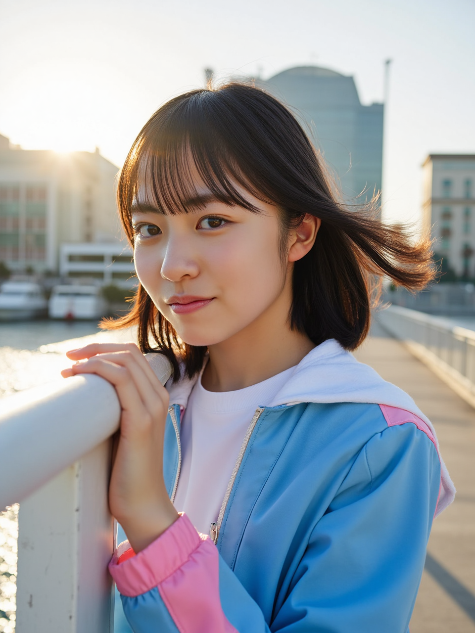 SHOGENJI, The image is a close-up portrait of a young Asian woman with shoulder-length dark hair and bangs. Her hair flutters in the wind, her hair disheveled. Her skin is very fair and her figure is slim. She is wearing a blue and pink jacket with a white t-shirt underneath that pops against the bright sunlight. The bridge is made of white metal railings, and the sun's rays create a warm, golden glow. She grabbed the railing with her hand and looked into the distance, revealing a contemplative expression. In the background, there's a bustling waterfront with buildings, including a big-ass industrial-looking structure with a glass facade, and a few boats chilling in the water. The whole scene is bathed in a soft, warm light, giving off a peaceful, early morning vibe. The overall color of the image is bright and soft.