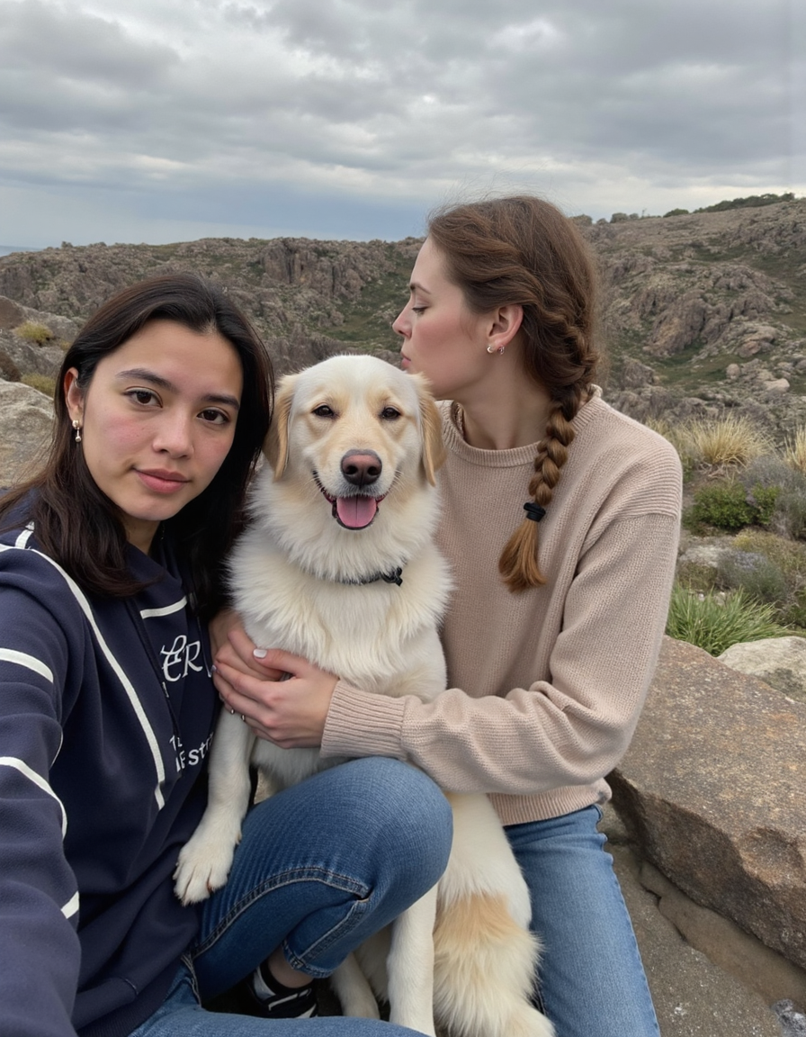 two women taking a selfie with a dog on a rocky hillside with a mountain in the background, profile picture, amateur iphone photo, socmed, <lora:Zphyr_FLUX_Photorealistic_LoRA:0.4> <lora:socmed_v2:0.65> <lora:photooo-000001:0.5> <lora:iphone-dev-7:0.65> <lora:amateurphoto-6version:0.65>
