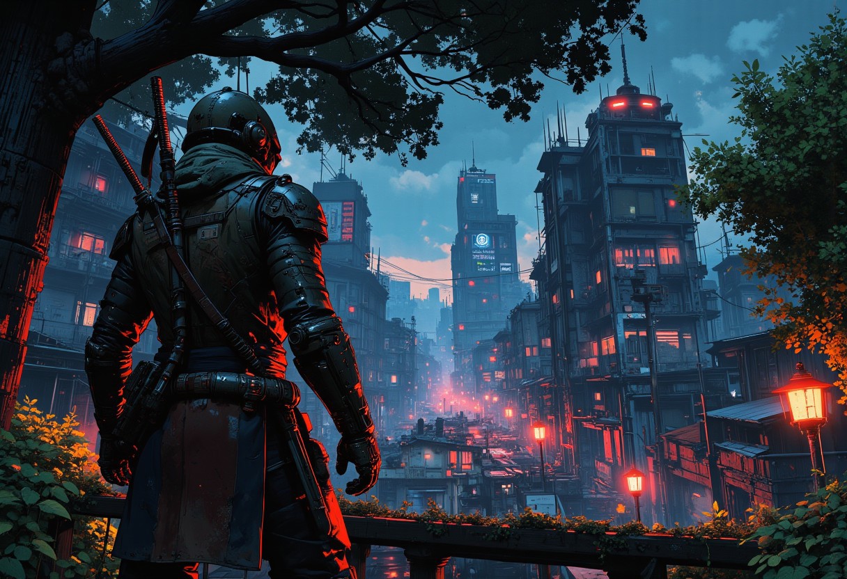 This high-quality digital artwork depicts a futuristic ninja warrior, with hood. He is standing in a garden, under a tree, on top of a building looking at the city. He has wears an armor with clothing parts and a katana on his back. At night. Intricate armor details. Steampunk city.Landscape view.A digital artwork in the style of cknc,, in the style of ck-mgs. Neon lights. The scene is dominated by blue, gray and red colors.DreamArt