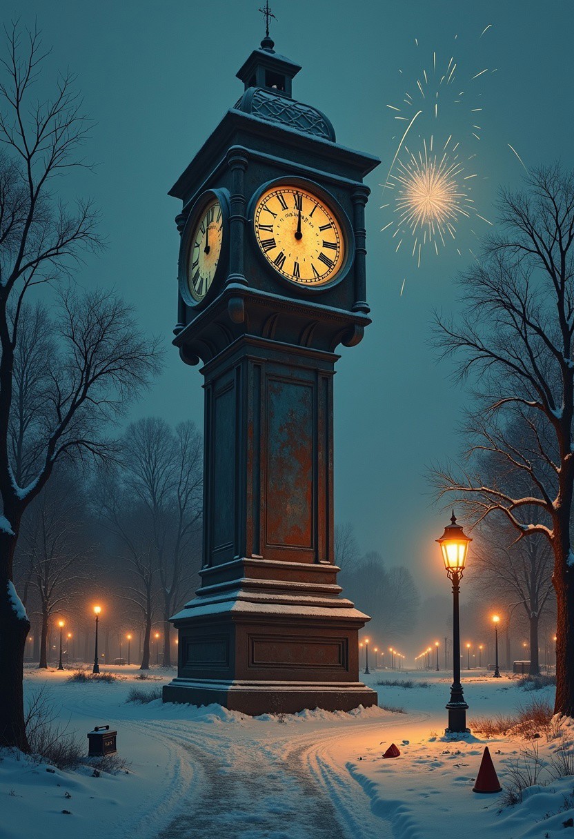 A weathered clocktower looms over a deserted square, its rusted hands paused at (midnight:2). (Fireworks:2) fade into the starless sky, leaving trails of smoke. Snow blankets abandoned (party hats:2) and (empty glasses:2). Dim lanterns flicker, casting trembling shadows, as the world silently mourns the passing of another fleeting year.