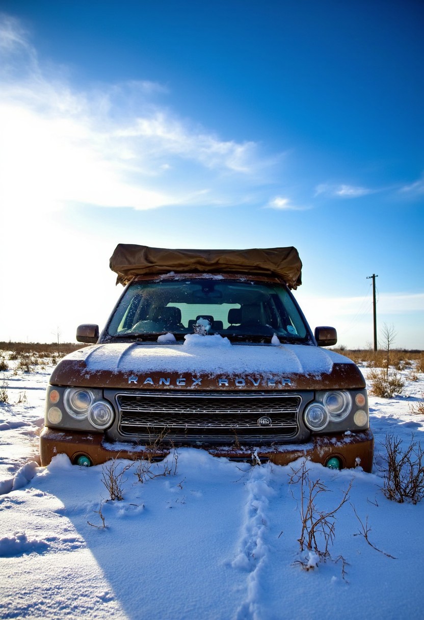 Generate a post-apocalyptic winter scene featuring an abandoned car in a snowy field. The car should be a range rover l322 a rusty brown color and a large silver grille. It should be partially buried in deep snow, with the front end visible and the rear end submerged. The car's windshield should be covered in snow, and there should be a brown tarp or cover on the roof. The surrounding field should be covered in thick, undisturbed snow, with a few dead plants or twigs poking through. The sky should be a vibrant blue with wispy white clouds, and the sun should be visible in the top left corner, casting a warm glow over the scene. The overall atmosphere should be one of desolation and abandonment, with the contrast between the warm sunlight and the cold, snowy landscape creating a striking visual. The image should have a slightly surreal quality, with enhanced colors and contrast to emphasize the post-apocalyptic feel. Include subtle details like snow on the car's headlights and taillights, frost on the windshield, and a slight mist in the air to add depth and atmosphere to the scene. detailifier