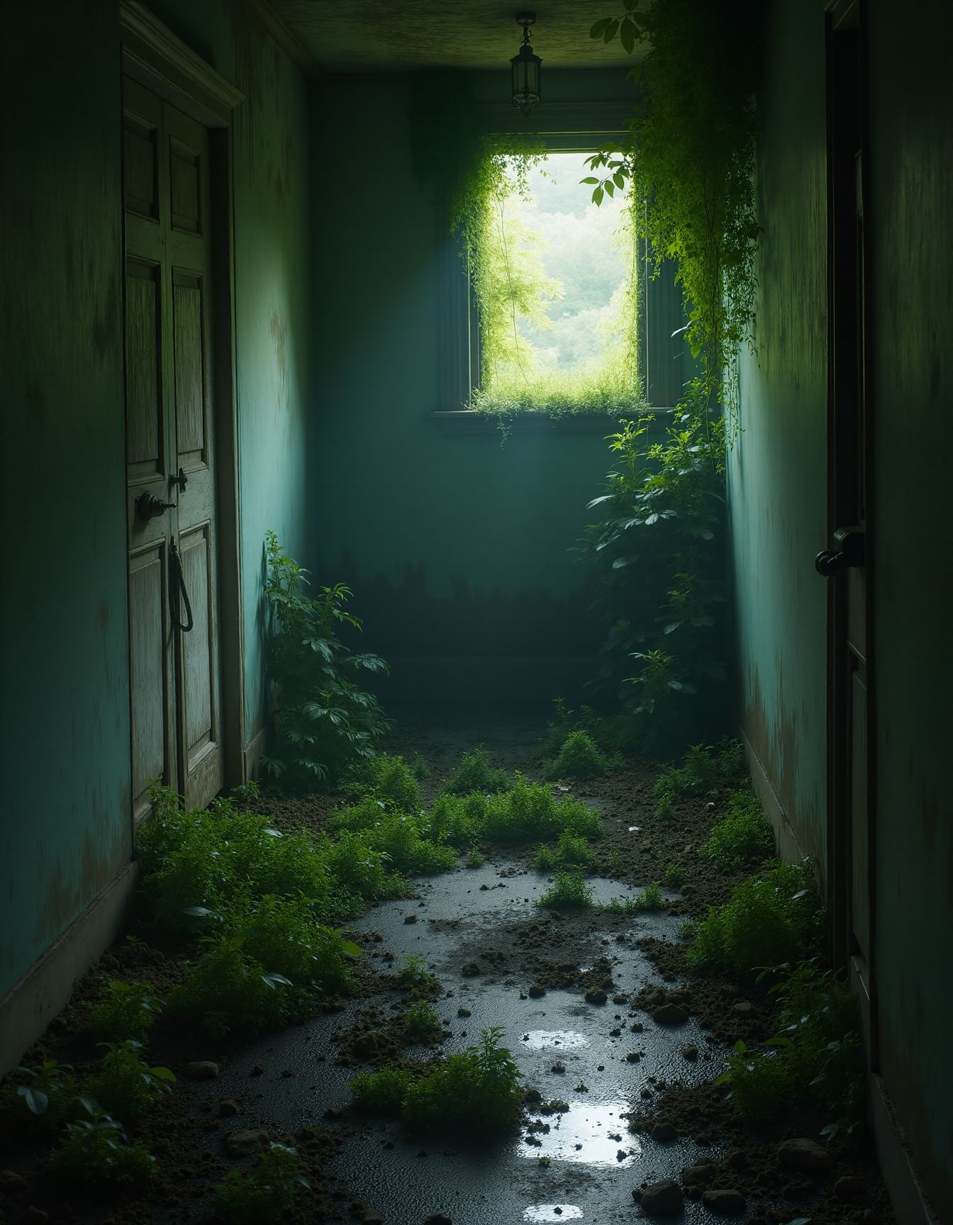 into the dismal oubliette, dusty and wet, covered in overgrowth