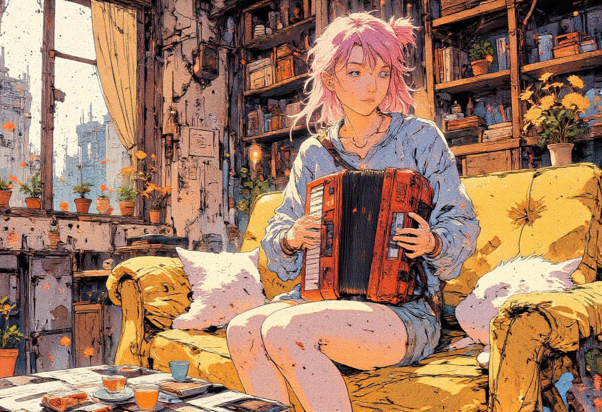 A vibrant and cozy anime-style illustration depicting a young woman sitting on a comfortable yellow sofa in a warmly lit living room. The composition is intimate, capturing a three-quarter view of the woman as she plays a vintage red accordion. Her posture is relaxed yet focused, her gaze slightly tilted, reflecting a serene and contemplative mood. The woman has short, tousled pastel pink hair with soft bangs that frame her face, complementing her pale complexion. Her outfit is casual, consisting of a loose light-blue sweater with a wide neckline, revealing her shoulders, and light denim shorts. The minimalistic attire highlights her relaxed and artistic demeanor. The background showcases a charming and eclectic living space filled with bookshelves, potted plants, and decorative knick-knacks. A small white dragon rests beside her on the sofa, adding warmth and a sense of companionship to the scene. The lower portion of the image includes a coffee table adorned with a cup of tea, a plate of strawberry-topped pastries, scattered notes, and a sketchbook, enhancing the lived-in atmosphere. <lora:Anime v1.3:1.2> <lora:Blue_Future:0.9> <lora:Ethereal_Brush_Anime_v1.0:0.6> <lora:It's a LoRA for portraits, BUT! actually specialized in backgrounds. v1.0:0.2>