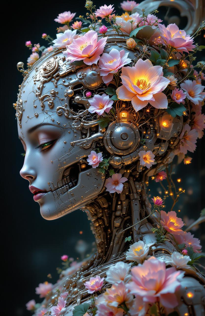 This stunning digital artwork presents an X-ray image of a woman's skeleton, seamlessly blending elements of cybernetics, botany, and alien flora and fauna. The piece is a masterful fusion of technology and nature, rendered with ultra-high definition details that capture the intricate beauty of both worlds. The central figure is a kind cyborg girl, her translucent body revealing the complex interplay of organic and mechanical components. Her skeleton is visible, with delicate bones and intricate joints rendered in exquisite detail. The organs within her body are also depicted with microscopic precision, showcasing the harmonious integration of biological and technological elements. Flowers and botanical elements are woven throughout her form, adding a touch of natural beauty and softness to her cybernetic enhancements. The alien flora and fauna are rendered with a sense of otherworldly wonder, their unique forms and colors adding a layer of mystery and intrigue to the scene. The botanical elements are not merely decorative; they seem to be an integral part of her being, as if she is a living embodiment of the harmony between nature and technology. Her face is shown with a serene and kind expression, her features a blend of human and anthropomorphic elements. The human torso and head are rendered with a sense of realism, while the botanical and cybernetic elements add a layer of fantasy and wonder. The membranes and vespertine details are depicted with a level of precision that captures the delicate and intricate structures of her form. The background is a blend of natural and technological elements, with terminals and microscopic details adding depth and complexity to the scene. The lighting is soft and ethereal, with gentle highlights and shadows that enhance the textures and contours of her form and the intricate details of the botanical and cybernetic elements. The overall composition is balanced, with the cyborg girl taking center stage while the background elements add depth and context to the scene. The emotional intensity of the image is captivating, with the harmonious blend of nature and technology creating a sense of awe and wonder. The style of the artwork is reminiscent of high-end digital art, blending elements of realism, fantasy, and botanical beauty to create a visually stunning and evocative image. Inspired by the works of Jesse Richards, this piece captures the essence of the cyborg girl's kind and harmonious nature, creating a visually stunning and emotionally resonant piece of art that draws the viewer into her enchanting and otherworldly realm.<lora:111622:1> Epic Image <lora:FluxMythP0rtr4itStyle:0.35> mythp0rt <lora:Flacs_Enhancer:1> ff-enhance <lora:Ethereal_Photography:0.35> ethereal_photography, ethereal_inuendo, <lora:FluxDFaeTasticDetails:0.5> <lora:flux.1_lora_flyway_Epic-detail_v2:0.5>