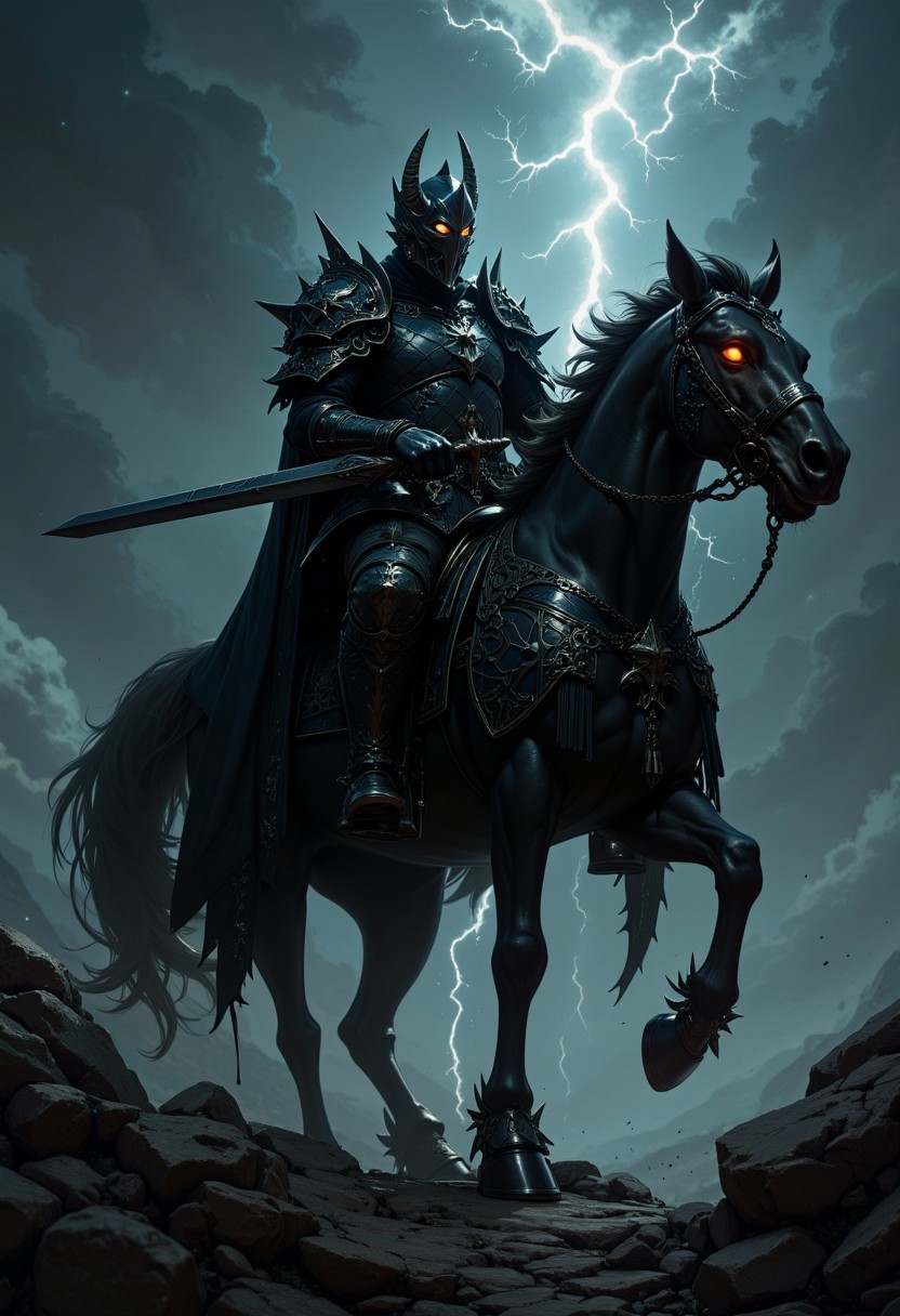 A dark, moody, and ominous fantasy scene featuring a black armored knight riding a black horse, both covered in intricate, gothic armor with spikes and sharp edges. The knight is wielding a large sword and has a helmet with horns. The background is a stormy, dark sky with lightning illuminating the scene, creating a dramatic and intense atmosphere. The horse's eyes glow with an eerie light, adding to the supernatural feel. The ground is rocky and jagged, enhancing the overall dark and foreboding setting. The art style is highly detailed and realistic, with a dark and gothic aesthetic.