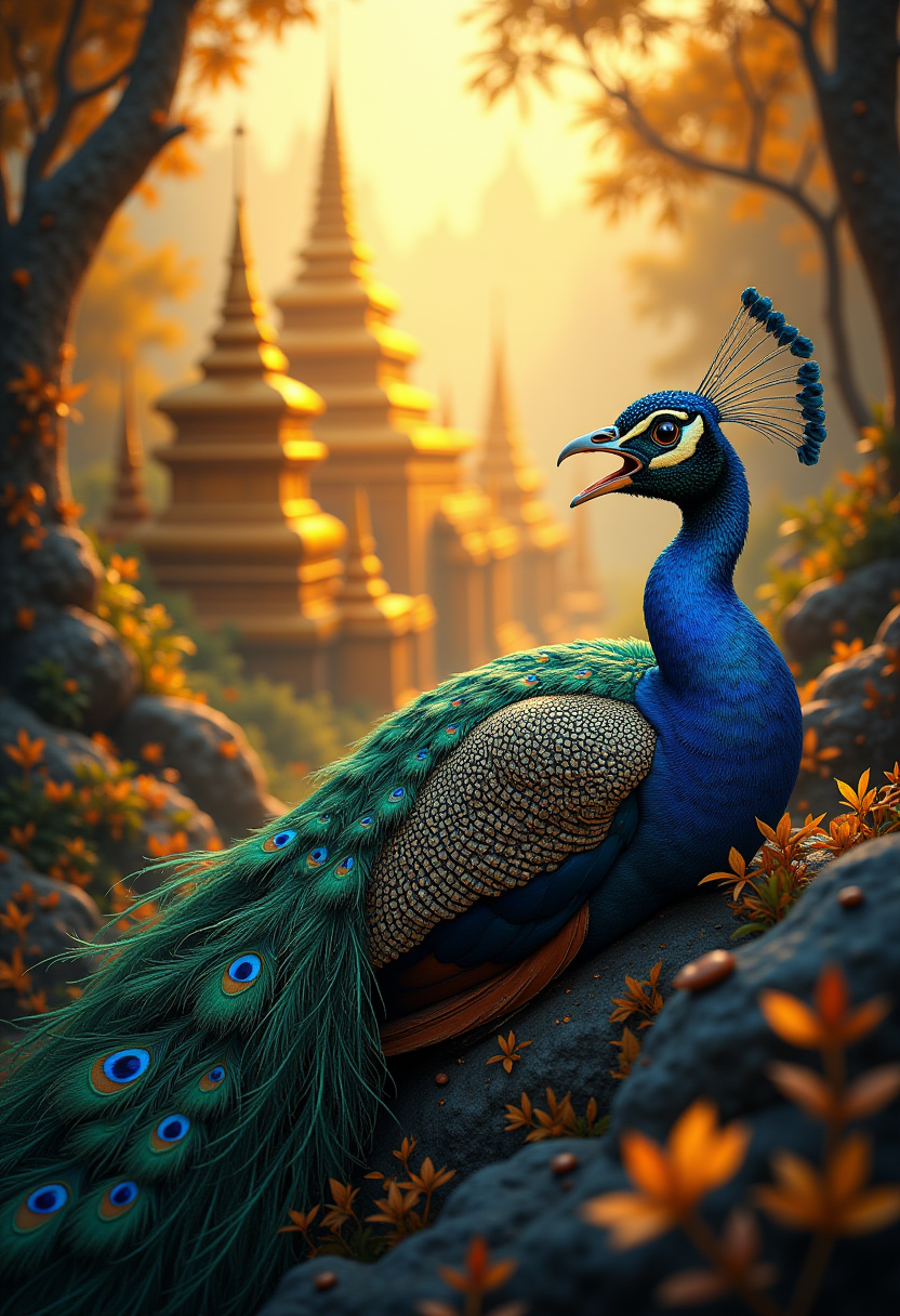 In this enchanting tableau, a captivating peacock feather steals the spotlight amidst a majestic landscape graced by ethereal golden temples. Vibrant splashes of iridescent blues and greens glisten on the plumage, complementing the warm ambiance of the temples' shimmering gold surfaces illuminated by dappled sunlight that lends an ethereal glow. The masterful composition accentuates depth, as the temples gradually fade into the distance, elegantly highlighting the exquisite feather as the focal point. Reminiscent of Monet's exquisite harmony of nature and architecture, this sublime scene exudes an otherworldly charm as if inviting one to embrace its cinematic splendor. ,<lora:we_du_v2.safetensors:1.0>