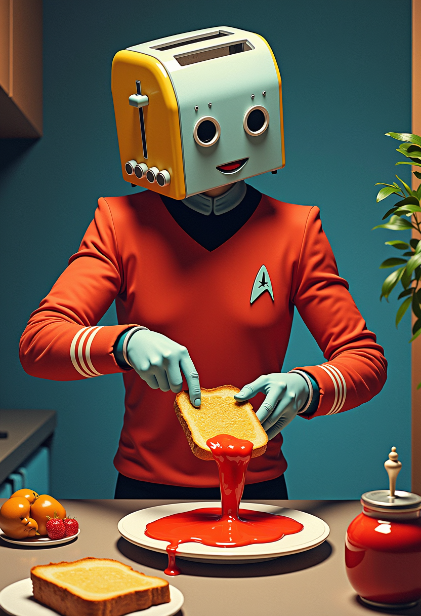 megazine cover, art by Filip Hodas, creature with toaster head wearing star trek crew costume, the creature is spreading jam on bread, dynamic pose, Sci-fi digital art, dystopian landscapes, surreal compositions, vibrant colors