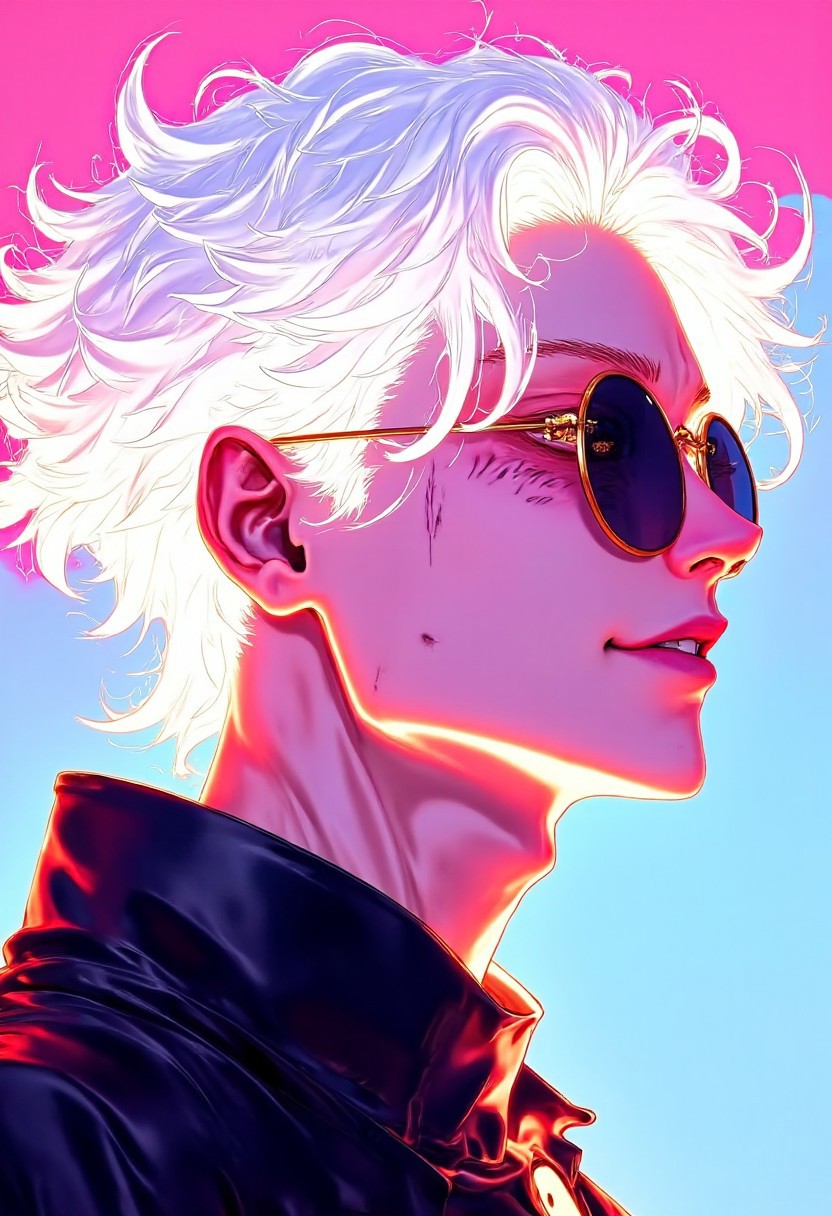 This is a digital illustration in a stylized, anime-inspired art style. The image features a striking, close-up profile of a male figure with an androgynous appearance. The subject has a light, almost ethereal complexion and wavy, platinum blonde hair that flows dramatically, with glowing, neon accents adding an otherworldly effect. He wears round, gold-rimmed sunglasses, which are tinted a deep, smoky color, enhancing the mysterious aura.