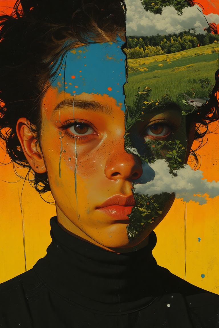 This digital artwork presents a striking, close-up portrait of a person with dark skin and curly hair, rendered in a vibrant, surreal style. The face is divided vertically into three distinct sections: the left half is painted in a deep, rich blue, while the right half transitions from warm yellow to orange, symbolizing the setting sun. The person's eyes are deep brown, filled with emotion, and a single tear cascades down the blue half of the face, adding to the evocative nature of the image. The background mirrors the sunset theme, with a gradient of yellow and orange, enhancing the warmth of the scene. On the right side of the face, a delicate, colorful floral pattern of white and yellow flowers is superimposed, blending into a lush green landscape. The person wears a high-necked, black garment that starkly contrasts with the vibrant hues of the face and the background. The overall style is highly stylized, emphasizing smooth gradient transitions and bold, contrasting colors, which amplify the emotional intensity of the composition. The glossy texture typical of digital art further enhances the vividness of the colors, contributing to the visually striking and emotionally poignant atmosphere of the piece.