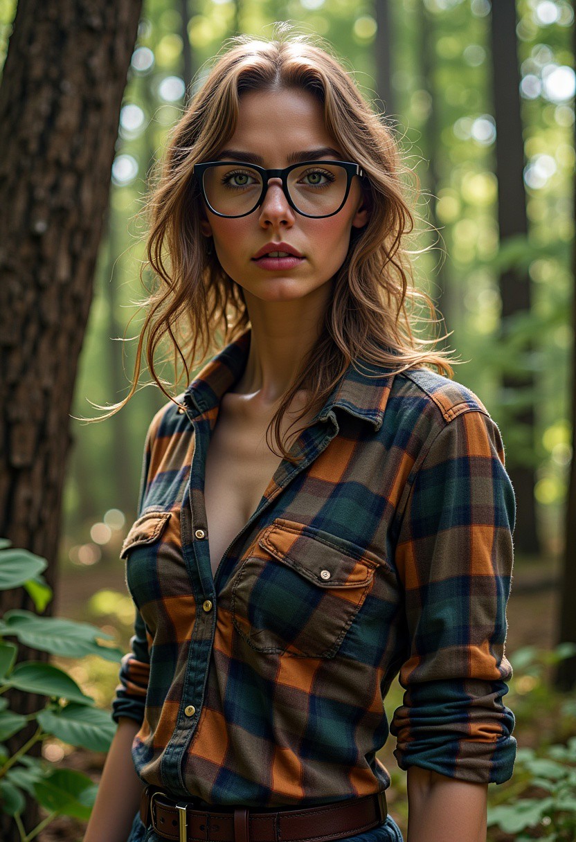 (masterpiece), best quality, expressive eyes, perfect face (((Large breasts))), ((cleavage)), In the heart of the forest, dappled sunlight filters through the thick canopy, casting a gentle glow on the scene. Amidst the towering trees stands a woman, her attire harmonizing with the natural palette surrounding her. She wears a lumberjack shirt, its plaid pattern echoing the earthy hues of the moss-covered ground and the rich browns of the tree trunks. The fabric of the shirt is sturdy, hinting at countless adventures in the great outdoors. Sleeves rolled up, revealing forearms bearing the faint marks of past endeavors. Around her waist, a utilitarian belt holds essentials for the journey – perhaps a multitool, a compass, or other tools of the trade. Square glasses adorn her face, adding a touch of intellectual flair to the rugged ensemble. The frames, weathered by exposure to the elements, carry a story of countless days spent immersed in nature. Behind those lenses, eyes gleam with a mix of curiosity and familiarity with the wilderness. Her boots, well-worn and caked with the evidence of various terrains conquered, crunch softly on the fallen leaves as she moves with purpose. A subtle scent of pine hangs in the air, and the occasional rustle of wildlife adds a soundtrack to her forest expedition. In this sylvan sanctuary, she embodies a fusion of style and functionality, seamlessly blending into the untamed beauty that surrounds her.