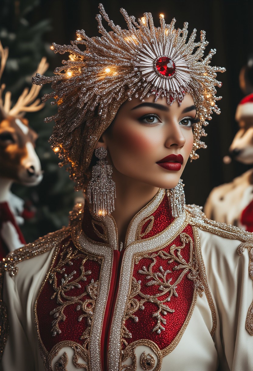a realsitic photosession of a Christmas fashion week at the North Pole that jingles all the way and shine Svarowsky cristals like a snowflakes and diamands of holiday lights with a festive groove and glittering fabrics, bold color palettes, and accessories that scream holiday <lora:ChristmasCouture:1>