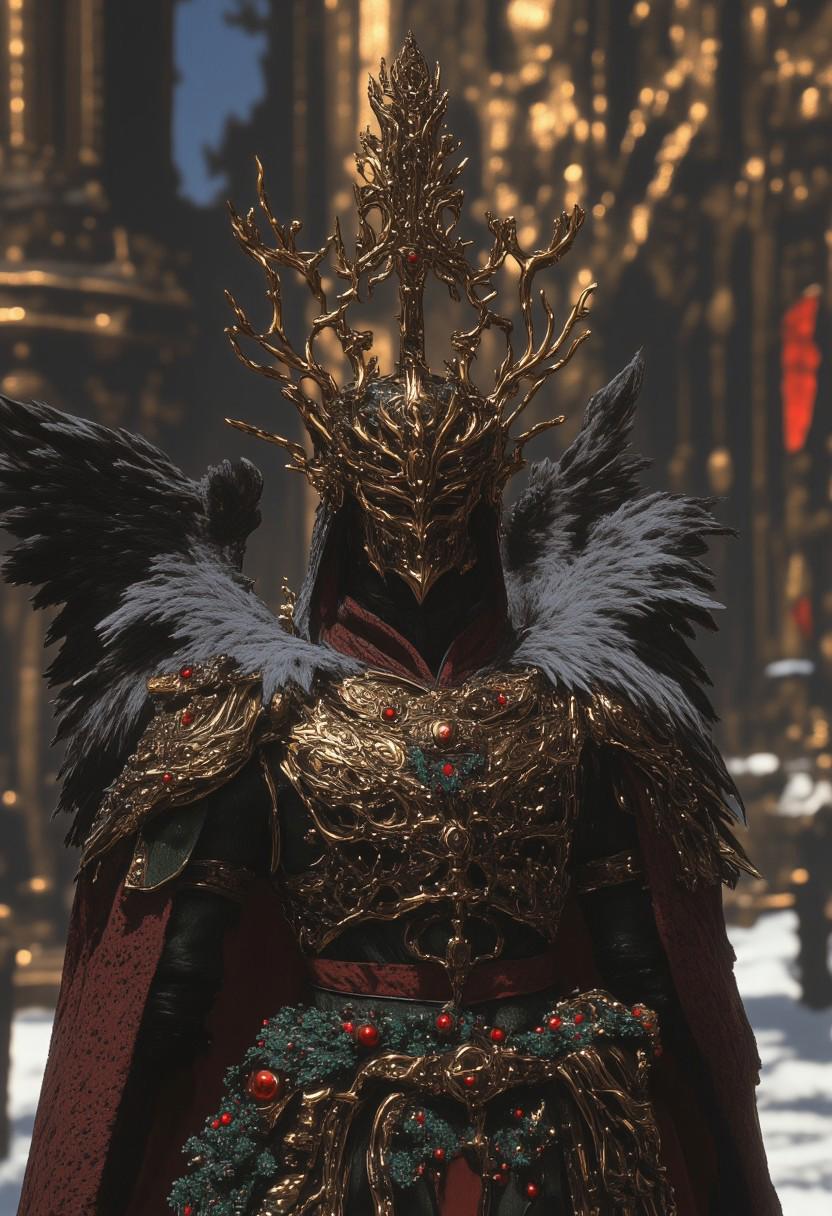 Reindeer clad in stunning ornate Christmas armour, The armor is accented with Christmas ornaments and gold accents, Victorian, wings, fur-lined cape, military-style, full body portrait. The background is an extravagant winter wonderland decorated with Christmas decorations, photo-realistic octane render, 4k, 8k, 16k HD FHD, ne0nfant4sy