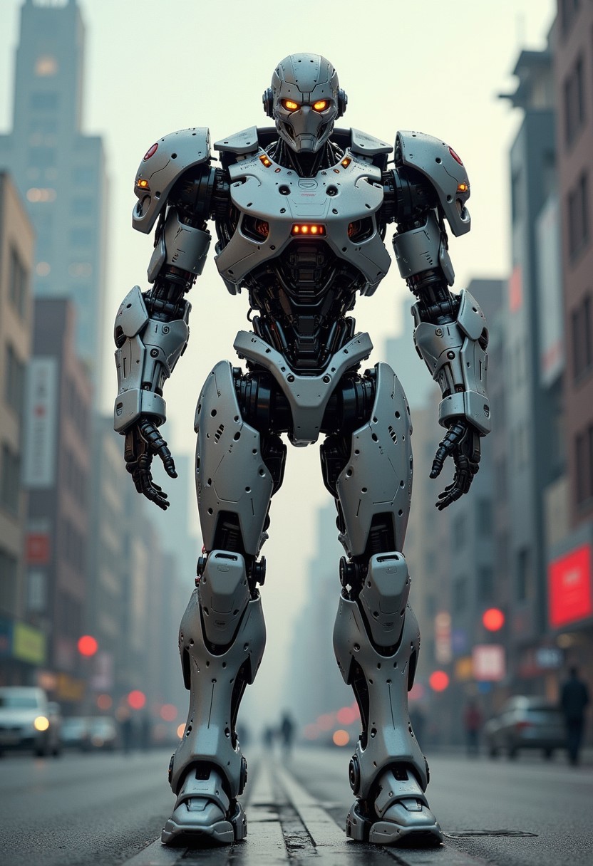 (RAW photo, best quality), (realistic, photo-Realistic:1.1), best quality, masterpiece, beautiful and aesthetic, 16K, (HDR:1.2), high contrast, (vibrant color:1.3), (muted colors, dim colors, soothing tones:0), cinematic lighting, ambient lighting, sidelighting, Exquisite details and textures, cinematic shot, Warm tone, (Bright and intense:1.1), wide shot, ultra realistic illustration, siena natural ratio, head to toe, masterpiece, 4k, highres, UHD, detailed joints, real robot, dynamic pose, bright eyes, (masterpiece:1.5, best quality:1.5, extremely delicate:1.5), (male:1.5), the image is featuring a humanoid Mecha, fully enclosed shoulder guards, matching arm and leg guards, full body, full armor, the design balances heavy with agility, (the color scheme is primarily White with Black and Red accents, the concept Inspired by Robot Anime, ROBOTANIMESTYLE), organic biotech armor, standing, floating high above the futuristic sci-fi city, exquisite and mature art style, (aura effect, glowing eyes, the armor glows), metallic, dramatic, high definition, highres, ultra-detailed, ultra-fine painting, professional, perfect body proportions, anatomically correct, symmetrical face, extremely detailed eyes and face, high quality eyes, creativity, RAW photo, UHD, 32k, Natural light, cinematic lighting, masterpiece-anatomy-perfect, a_skynet_cyberdyne_craft,