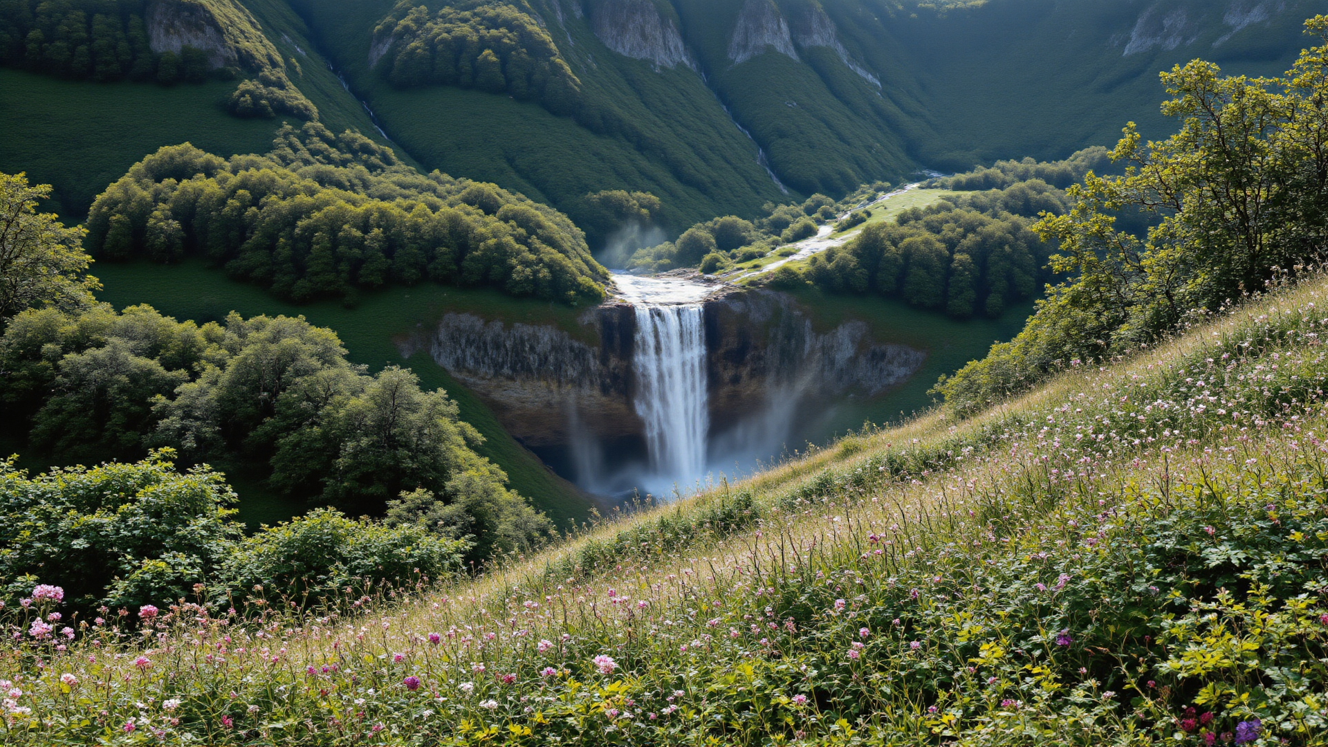 photograph of A serene landscape unfolds from a hilltop overlooking a gentle river in valley that winds towards a majestic waterfall, cascading into a tranquil lake below. On the right, a dense forest of towering trees frames the scene. To the left, open clearings are dotted with colorful wildflowers, their petals swaying softly in the breeze. The air is fresh, the sky clear, and the lush greenery creates a peaceful, untouched atmosphere, where nature thrives in harmonious stillness. The distant roar of the waterfall adds a rhythmic melody to the quiet serenity of the scene. aidmafluxpro1.1