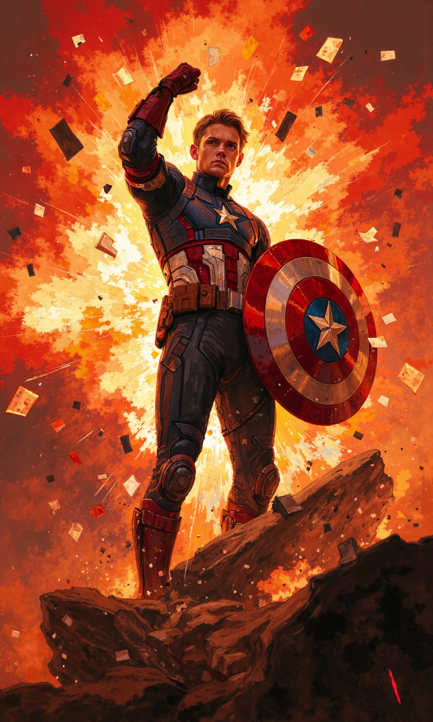 Full shot of a stylized depiction of Captain America, likely from a movie or comic book. The figure appears mid-action, in dynamic pose, with one arm raised. He's wearing a costume, likely stylized to reflect a superhero suit, and appears to be a light-skinned person. The costume is dark. A large, iconic shield is depicted in the foreground, as if in motion around the figureâs lower body, and parts of the shield are also interacting with the surrounding effects. The background is highly stylized, filled with radiating orange and red bursts/explosions, creating a powerful impact effect. Smaller particles or debris seem to be flying outwards from the central area, toward the edges of the frame; the effect gives a sense of energy and power. Light is emanating outward from the central focal point, giving a sense of dynamic energy. The colors are intense and are designed to emphasize the dramatic, action-hero scene., <lora:FLUX-daubrez-DB4RZ-v2:0.8> DB4RZ, DB4RZ style painting, <lora:t0m4zdrawing:0.6> t0m4z