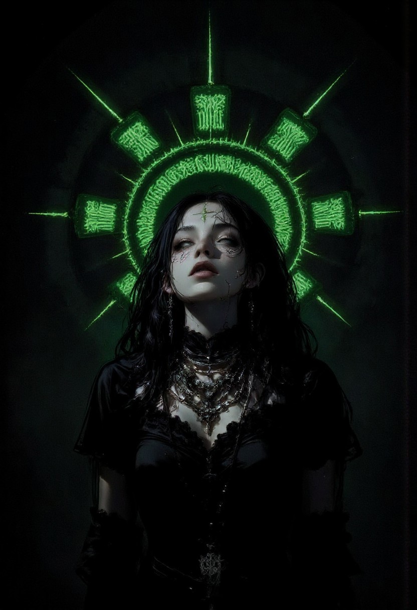 The image is a dark, high-contrast digital artwork featuring a stylized, surreal depiction of a woman. The artwork is rendered in a monochromatic palette with strong green and black tones, creating an eerie, nightmarish atmosphere. The woman, who appears to be of mixed ethnicity with olive skin, has long, dark hair cascading down her back.