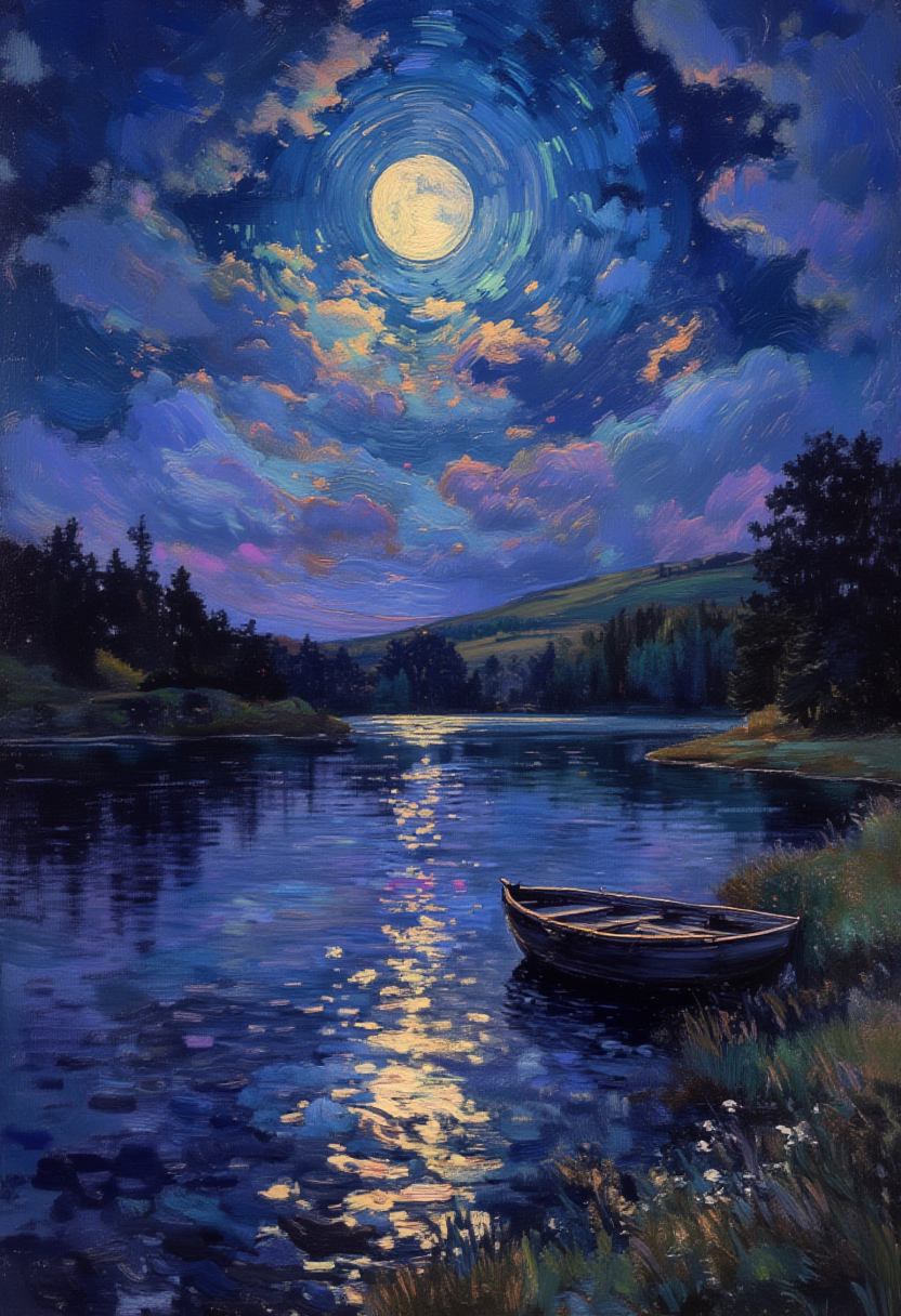 This awe-inspiring impressionist oil painting portrays a dreamlike Scottish moorland adorned with a serene lake under the delicate veil of moonlit clouds. The majestic full moon casts its mystical glow upon the scene, revealing a solitary wooden rowboat gently swaying upon the glassy water surface. The impasto technique effortlessly captures the ripples caused by a gentle breeze, creating a dynamic contrast between light and shade. The vibrant hues of the sky gradually transition into the rich blues and greens of the tranquil lake, engulfing the viewer in a harmonious blend of complementary colors. As you immerse yourself in the hushed stillness of this ethereal setting, a deep sense of calm and tranquility permeates your being - a testament to the remarkable artistic vision encapsulated within this remarkable piece. ,<lora:flux/OBä¸ä¸çºªæ²¹ç»v1.1.safetensors:1.0:1.0>