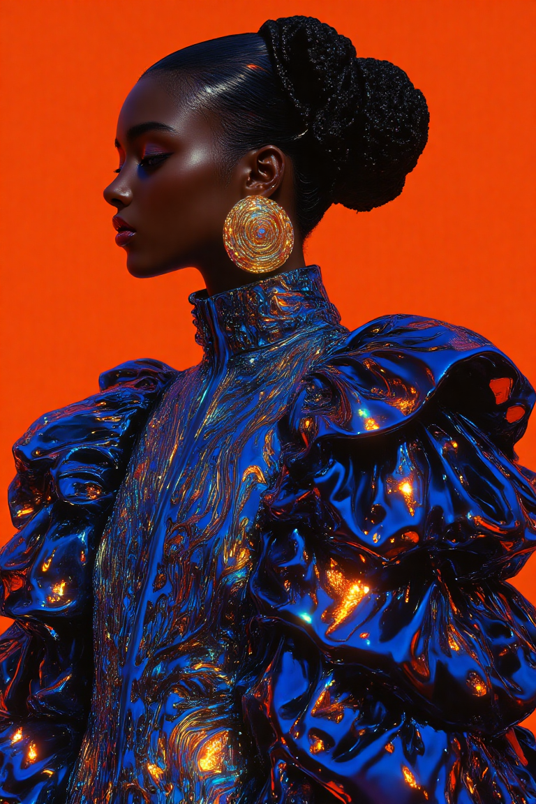 A hyper-realistic digital artwork inspired by 90s anime and manga, seamlessly blending Henri Matisse’s bold color contrasts with Alexander McQueen’s intricate textile artistry. The profile view captures a person with a rich, dark complexion exuding poise and elegance against a vibrant solid orange backdrop. They are adorned in a deep blue high-fashion ensemble crafted from a luxurious blend of glossy satin and velvet, with dramatic ruffled layers cascading from their shoulders and arms, forming a sculptural silhouette that radiates power and style. The fabric is adorned with intricate, lighter blue abstract patterns resembling flowing waves, adding depth, motion, and modern artistry. The outfit’s glossy texture gleams under the light, accentuating its opulence and dynamic rhythm. Surrounding the figure, the background features a mesmerizing optical illusion inspired by Bridget Riley’s "Fall," with sharp, interlocking black-and-white wavy lines subtly merging into the orange backdrop, creating surreal depth and a captivating visual flow that centers on the figure. The subject’s hair is styled in an elegant updo, with soft, loose strands framing their face, enhancing their sophistication. Large, round gold earrings gleam vividly, offering a striking contrast to the bold palette. Rendered in HD, 8K quality, this masterpiece is a flawless fusion of high fashion, bold artistry, and surreal elegance.