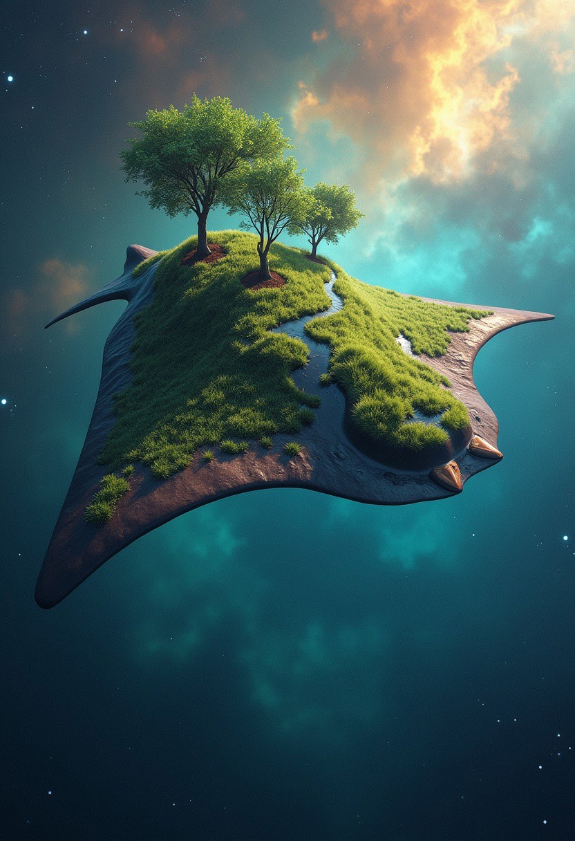A giant manta ray floating through space. A landscape with trees, grass and a river grows on his back. The background is dominated by a colorful nebula.