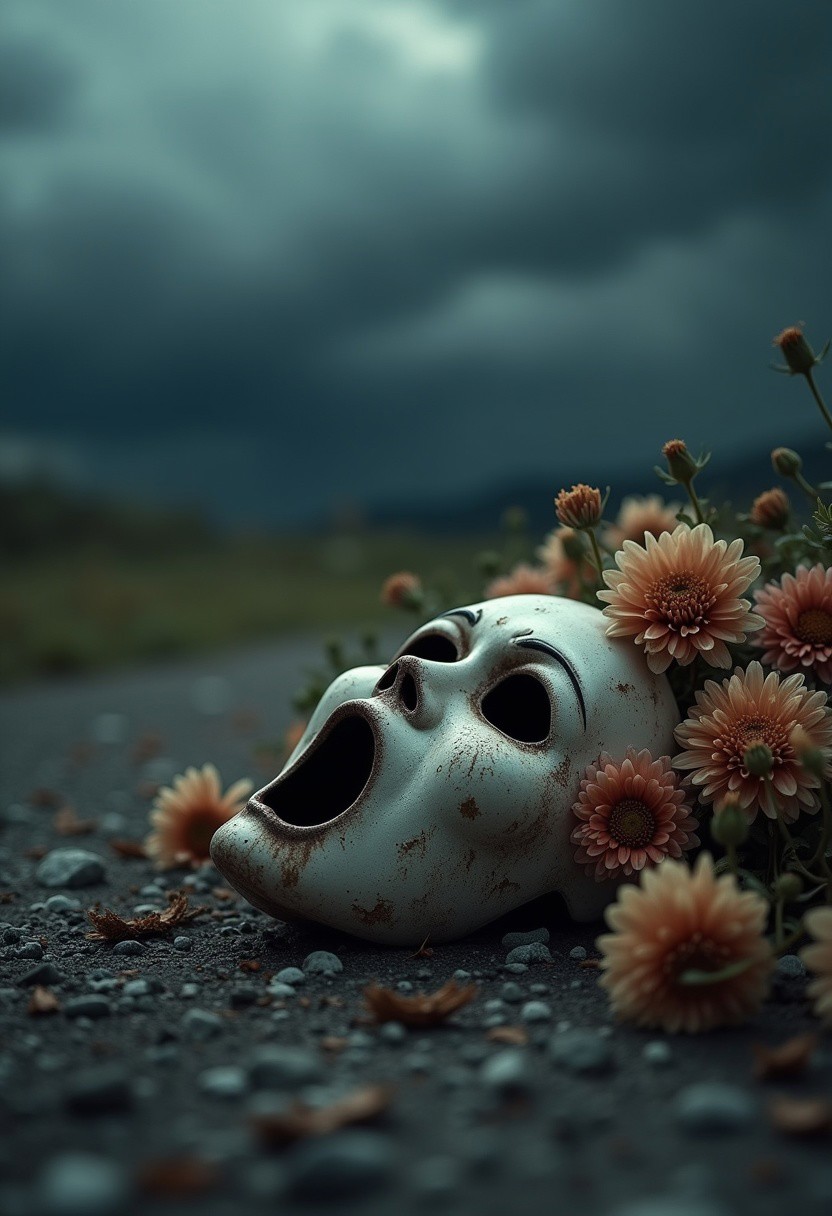An evocative, high-resolution photo capturing the haunting essence of 'The Silent Void'. A decaying and empty mask lies on a rugged surface, its silent scream a chilling reminder of the pain hidden beneath the facade. The mask is surrounded by a melancholic arrangement of withered flowers, their once-vibrant colors now faded to muted shades. The atmospheric background features a dark, stormy sky, hinting at an impending deluge that mirrors the emotional tempest within. The cinematic composition, enhanced by the vivid contrast and subtle textures, draws the viewer into this poignant portrayal of the struggle between outward appearances and the internal storm that rages unseen