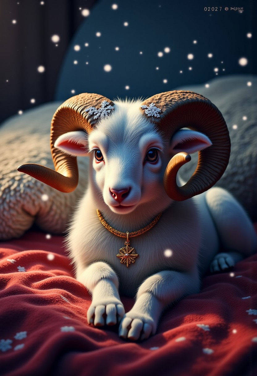 score_9, score_8_up, score_7_up, perfecteyes, pillow room, night, antro,ram, ram's horns, Christmas, sparkle,snowflakes, fluffy fur,full body ,gold jewellery,male,bo-christmas