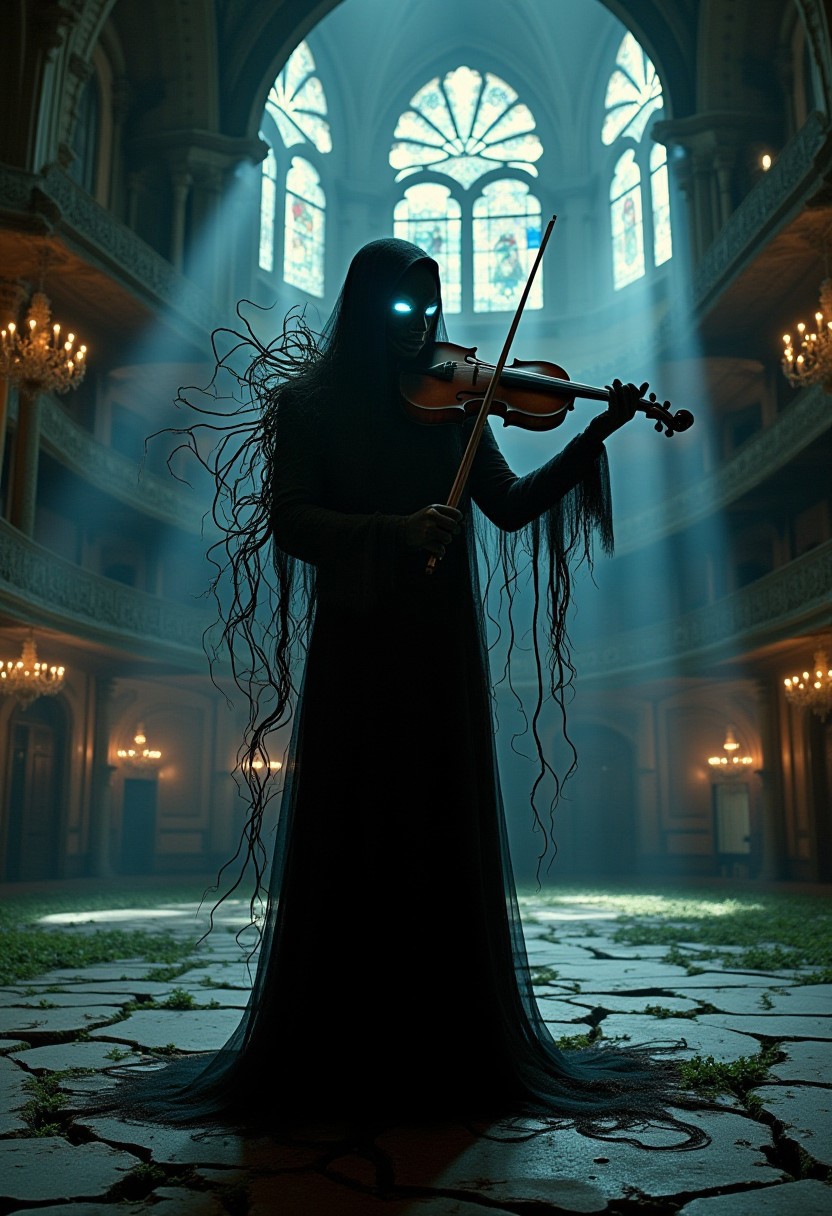 A masked violinist stands in a deserted opera house, their silhouette framed by shattered stained glass windows. Shadowy tendrils coil around their body, extending from a cursed violin that emits eerie, glowing notes. The stage beneath them is cracked and overtaken by creeping vines. In the background, dim chandeliers flicker, casting an ominous light over the abandoned grandeur, bo-christmas