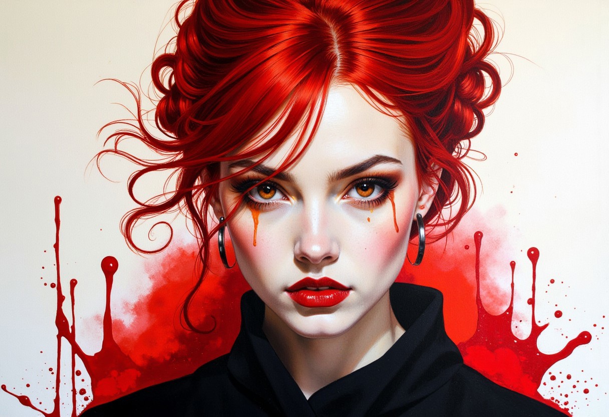 Portrait of a woman with striking features, showcasing vibrant red hair styled in an intricate messy bun, cascading strands framing her face. Her eyes glow with a fiery orange hue, adding an intense expression. The background is a blend of soft white and deep black, accented with splashes of red paint resembling drips, creating an atmosphere of both elegance and chaos. The overall aesthetic is hyperrealistic, capturing intricate details in her skin texture and the glossy effect of her lips. The interplay of color emphasizes the contrast between her pale skin and the vivid reds, evoking a sense of drama and emotion in the composition.