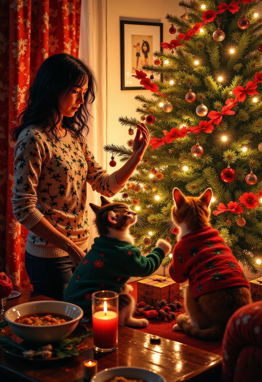 Faith Connors and two cats decorating Christmas tree, Christmas, Christmas party, Christmas tree, cozy, warm lighting, christmas living room, indoors, Cats has fluffy paws and wear Christmas sweaters, Mirror's Edge