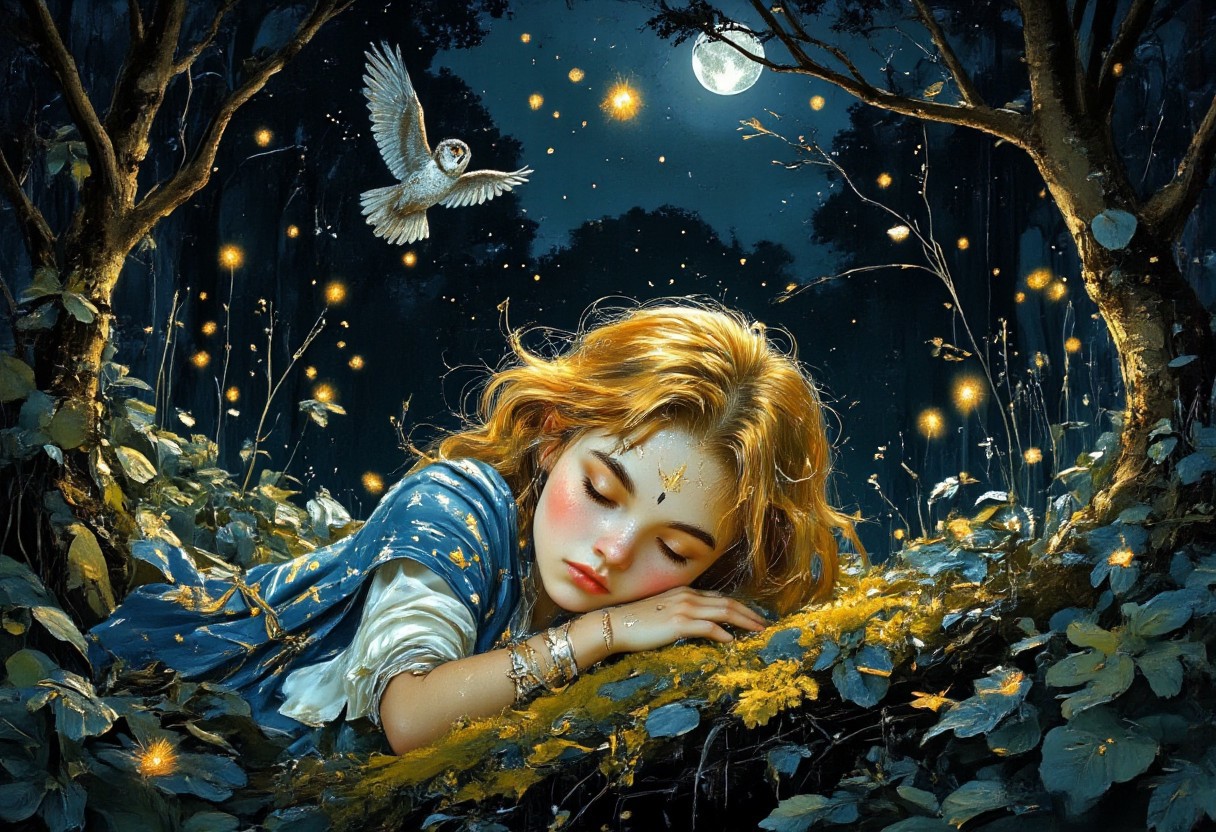 Storybook illustration artstyle. A girl with golden hair and a star on her forehead is lost in the forest. She has a simple cloak draped over her luxurious robe. It is a dark night and a girl sleeps on the moss in the moonlight. Fireflies are flying around. an owl watches over her safety