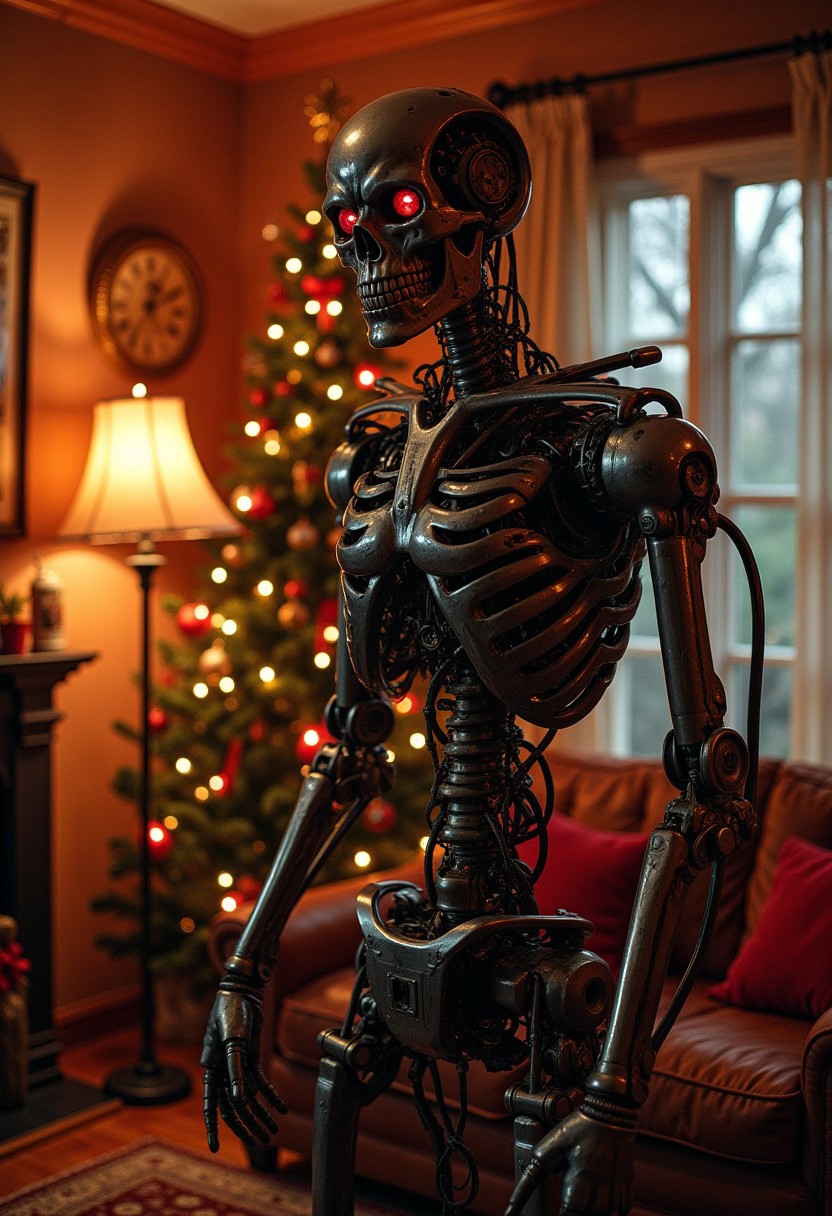christmas living room, Terminator T-800, hasta la vista, T800 robot acting weird, action scene, christmas movie, cinematic, great lighting, balanced, dynamic, exciting, cool, december, surreal, angry,