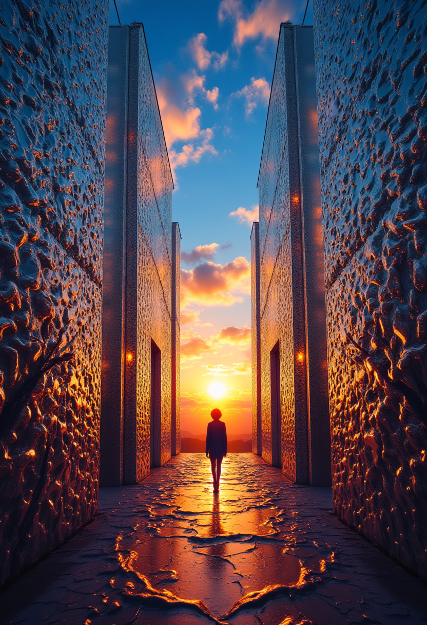 This captivating triptych showcases a surreal landscape featuring intricate glass branches cascading as if made of liquid sunlight. The vivid hues of an ethereal sunset paint the cerulean sky with vibrant reds, oranges, and deep yellows, contrasted by the dark, mysterious midnight blues shrouding the distant horizon. Each panel captures distinct ambiances - the left one draped in serene shadows cast by dancing cloud tendrils, while the right portrays a dazzling display of geometric prismatic light rays. At the heart of this mesmerizing masterpiece lies a solitary figure hovering within the magical transition zone, a seemingly weightless presence exuding an air of quiet contemplation amidst the harmonious chaos. Every detail is meticulously rendered with delicate brushstrokes, inviting the viewer to embark on an immersive journey into a fantastical world of artistic brilliance and boundless creativity. ,<lora:flux/aidmaHyperrealism-FLUX-v0.3.safetensors:1.0:1.0>