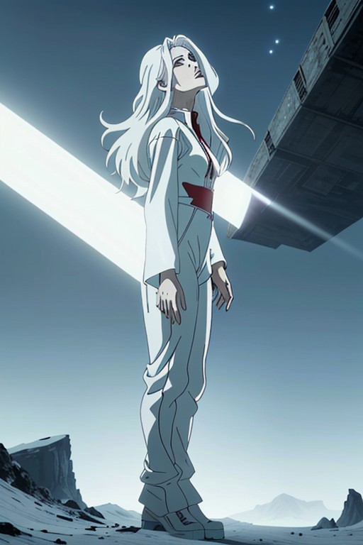 albino woman with long white hair and red eyes, hair blowing in the wind, wearing a white-and-silver jumpsuit, standing in a strange and somewhat sinister alien landscape on an alien world, looking up at the sky, full body shot, seen from the side, light coming from below, anime style, beautiful screenshot, stunning