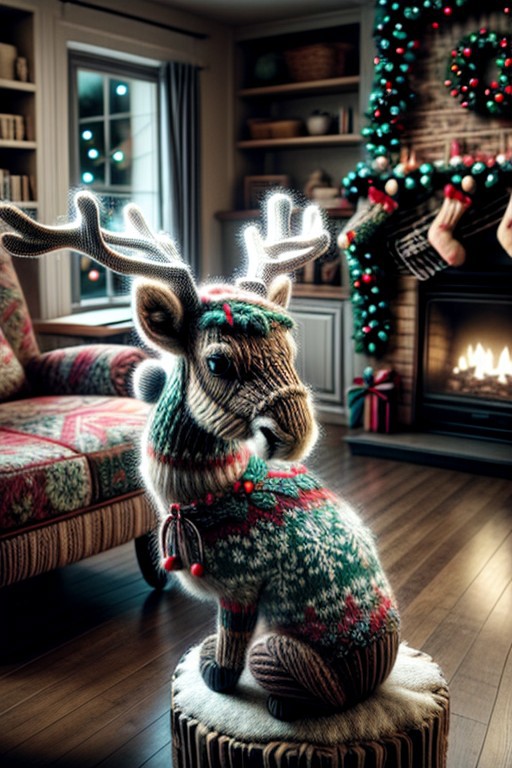 masterpiece, best quality, reindeer sitting on rocking chair, knitting Christmas sweater, colorful yarn balls, festive patterns, cozy fireplace, holiday scene, warm and cheerful atmosphere