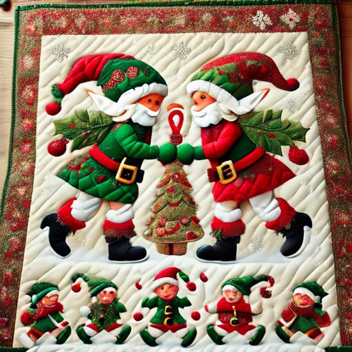 XmasQuilt of Christmas Elves wearing red and green, high quality, best quality, masterpeice