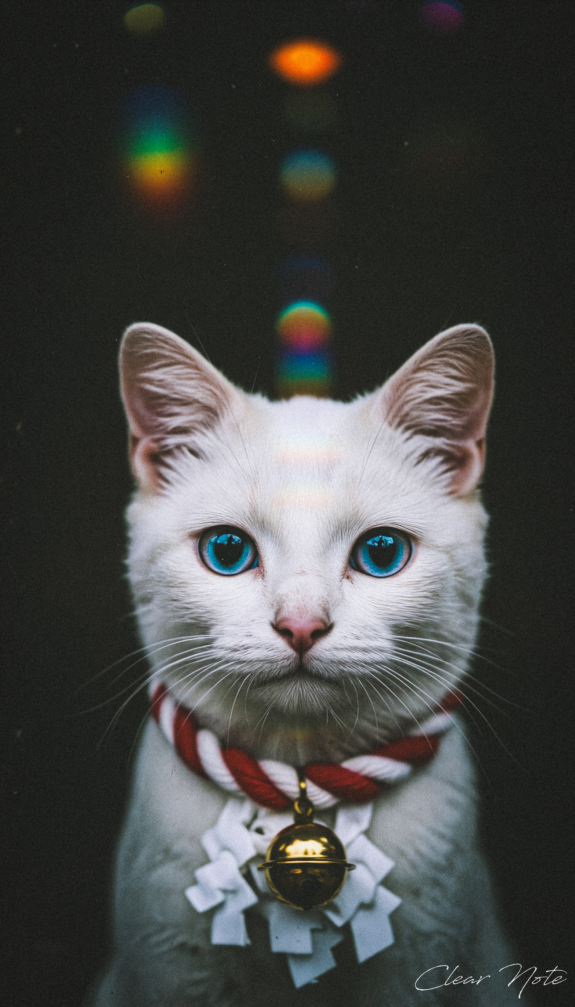 Japanese Culture Style, Emotional Photos, 35mm film, A serene white Japanese cat, wearing a red-and-white shimenawa and bell, embodying calm and auspicious New Year blessings.